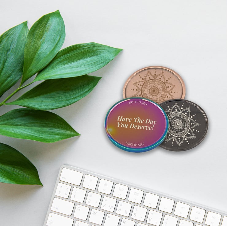 A unique and captivating metal penny designed to inspire mindfulness and positivity. On one side, you'll find the quote,"Have the day you deserve," a daily reminder to embrace the moments that come your way. The reverse side features a beautifully intricate mandala illustration, symbolizing harmony and the balance of life. Crafted with precision and purpose, this metal penny is not just a token of currency but a small, tangible piece of wisdom and art to carry with you on your journey.