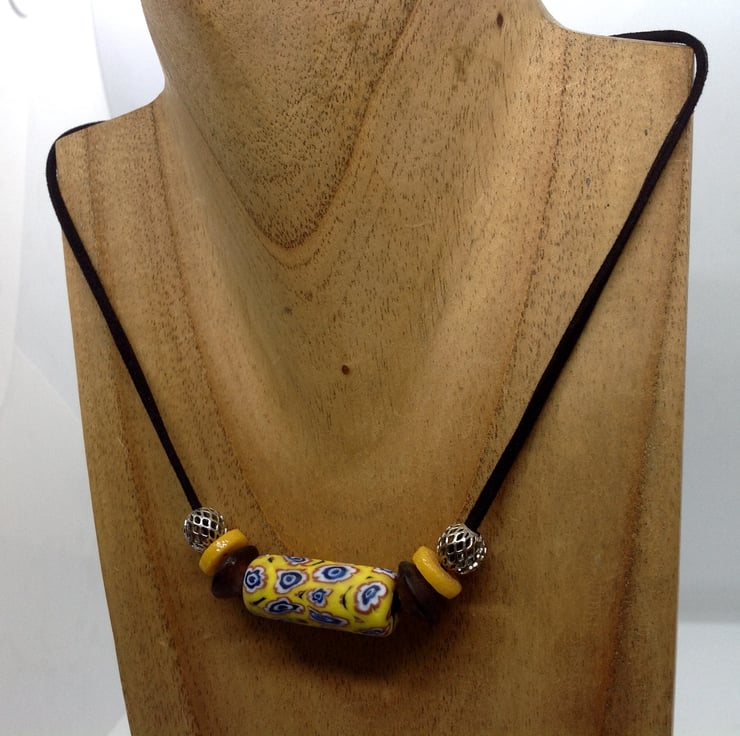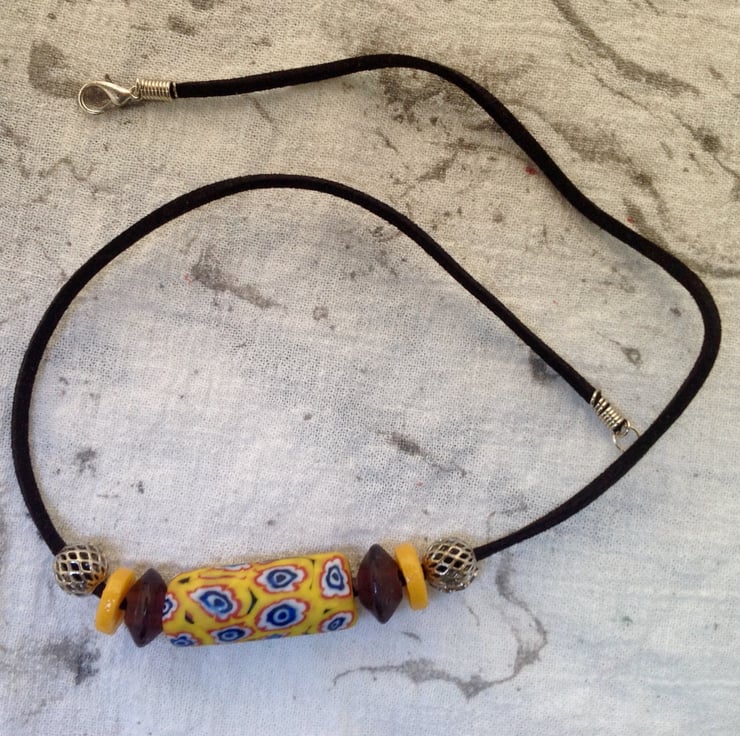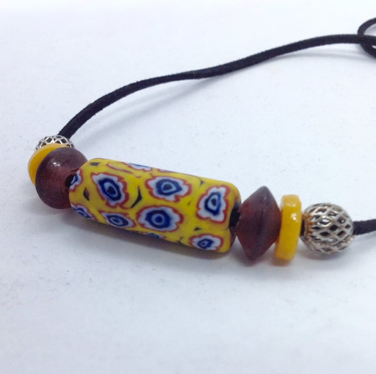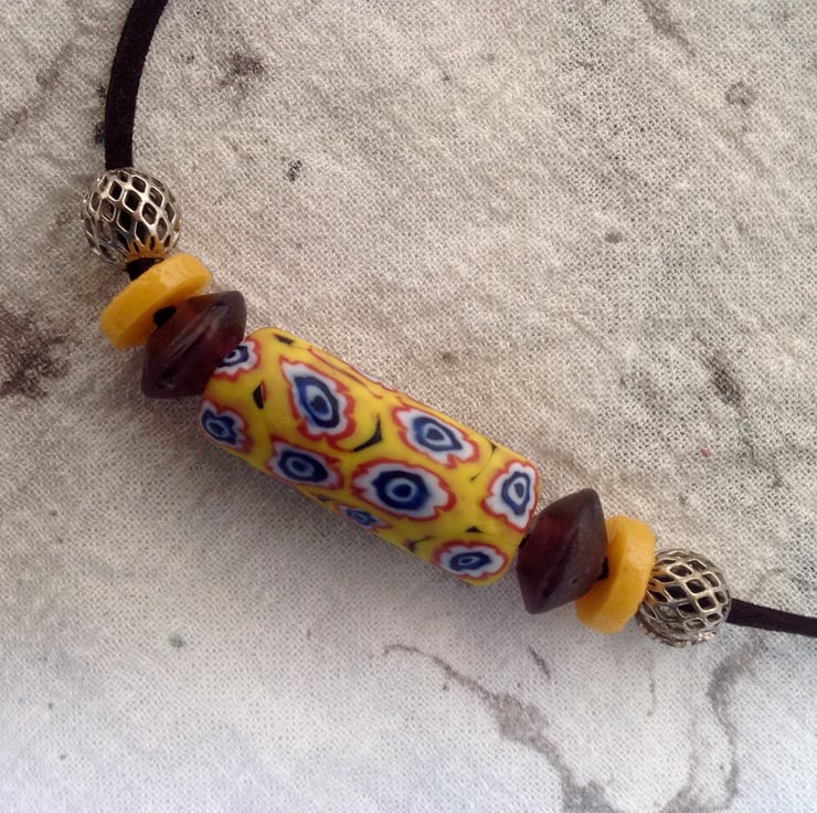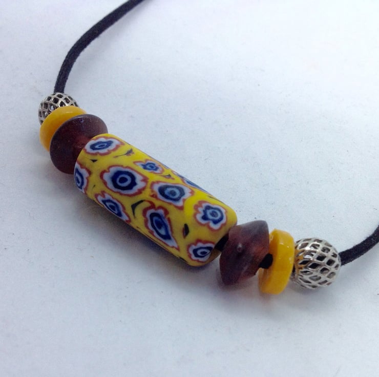 Unisex cord necklace with a huge yellow central Nepalese millefiori bead, two amethyst and two West African glass disc beads plus two silvertone filigree beads.