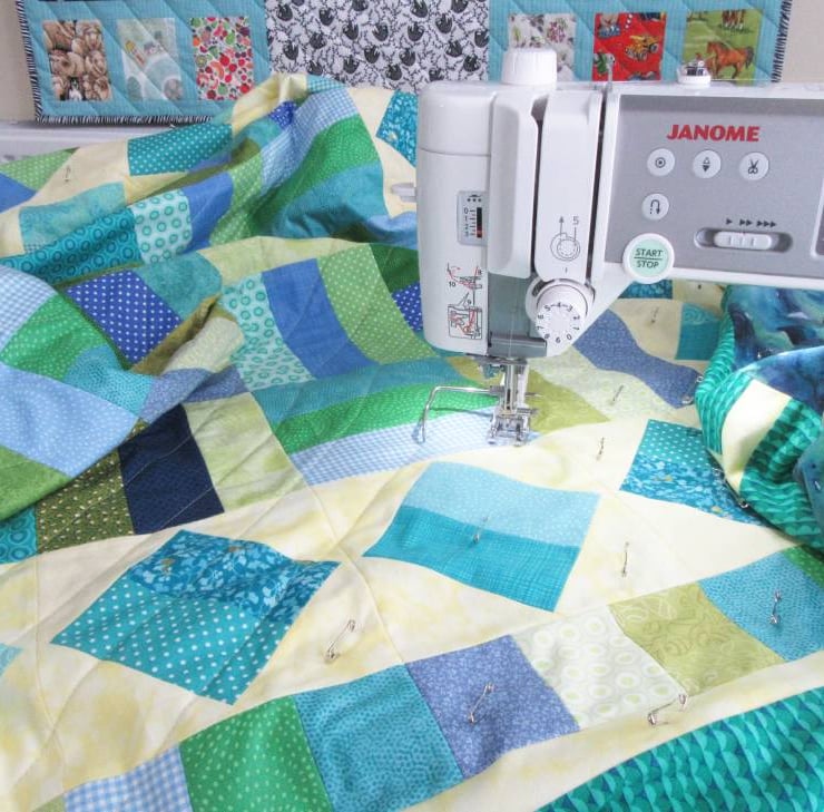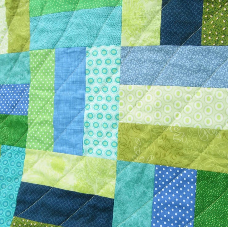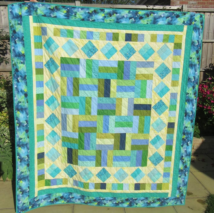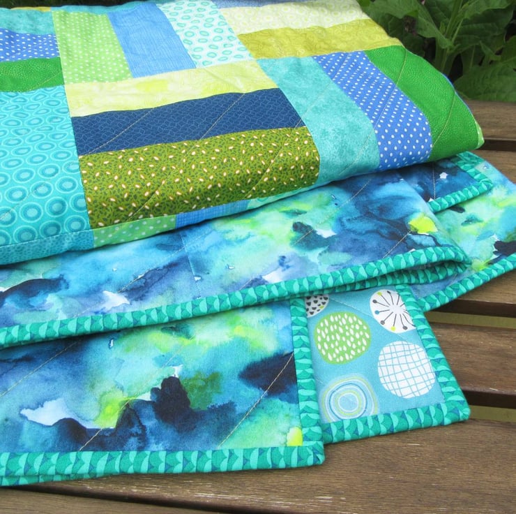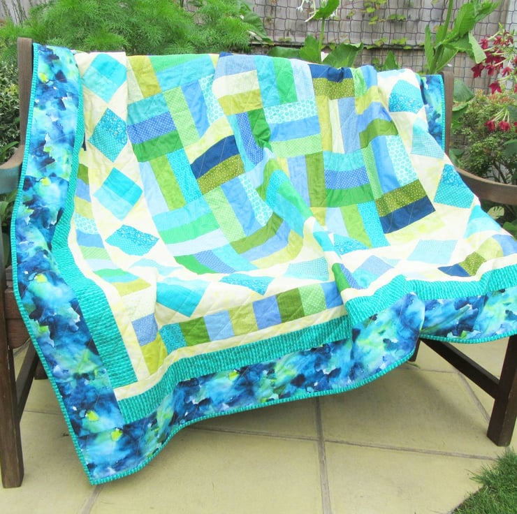 Cotton fabrics in vibrant shades of green, blue, aqua, turquoise and yellow have been used to give this patchwork throw a real seaside vibe.