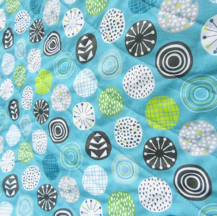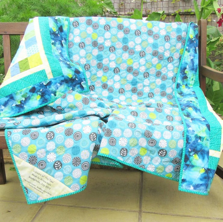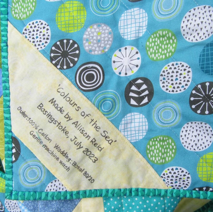 The backing fabric is a 100% cotton in turquoise with circular designs in green, blue and grey. Across one corner of the back I've stitched in place a label which gives details including the name, 'Colours of the Sea', when and where the quilt was made as well as washing instructions.