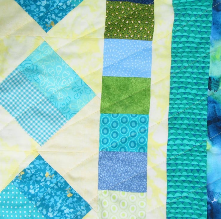The colours of these fabrics just made me think of the sea and I enjoyed quilting the wavy lines across to reference the gentle lap of waves on a sunny summer beach.
