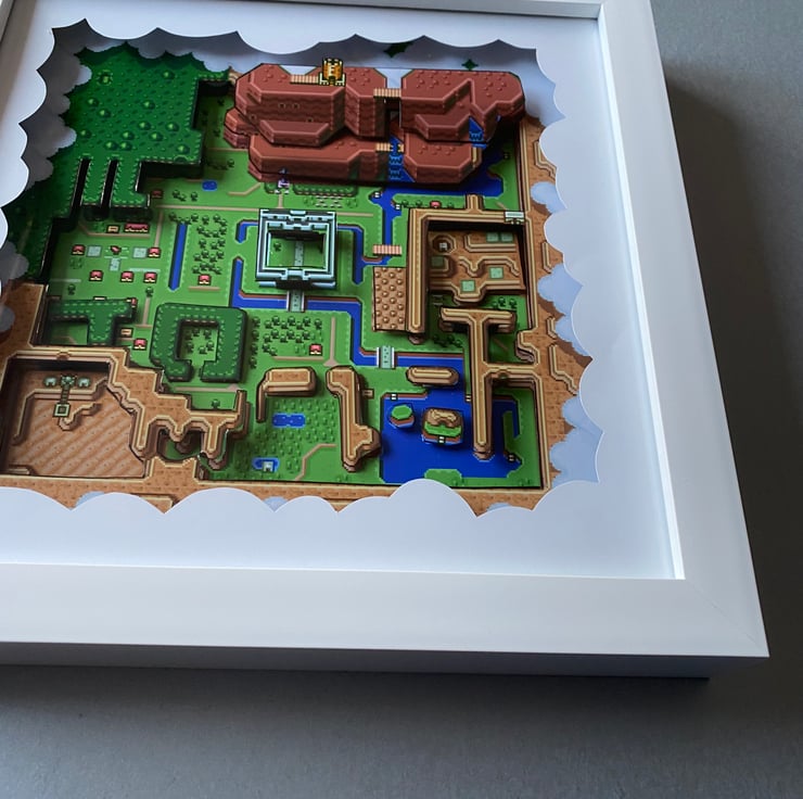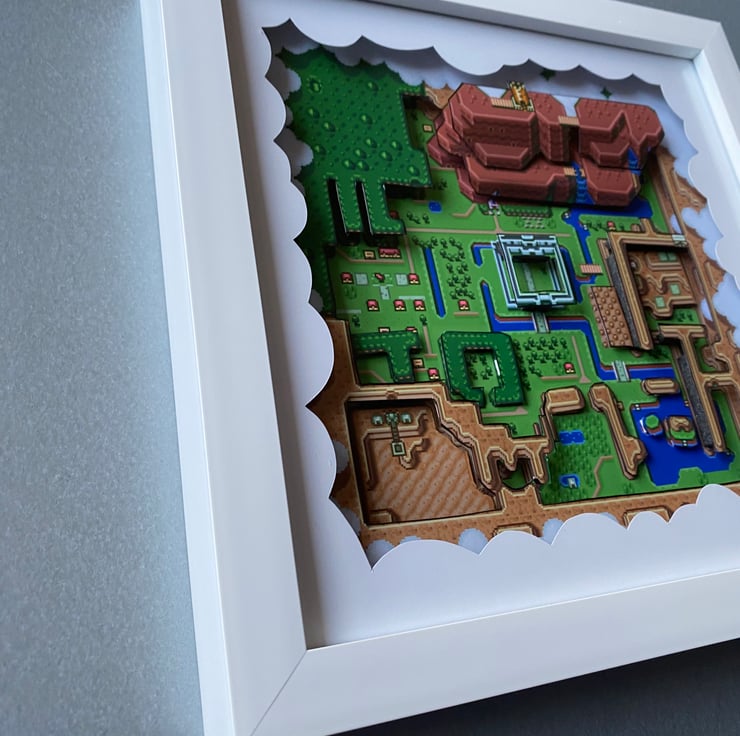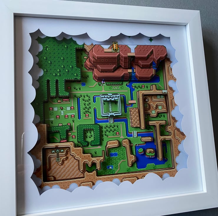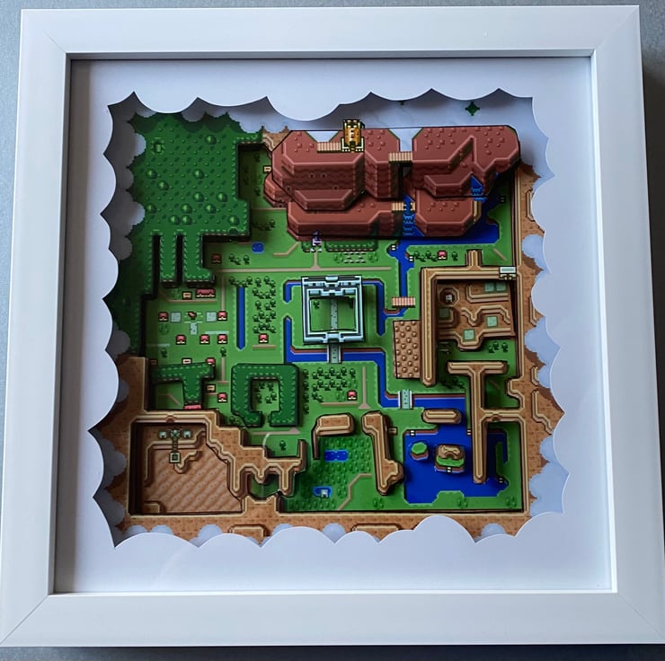 Hand crafted 3D map of Hyrule from Legend of Zelda Link to the Past, framed in a 10x10 inch high gloss shadow box frame with glass frontage