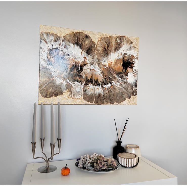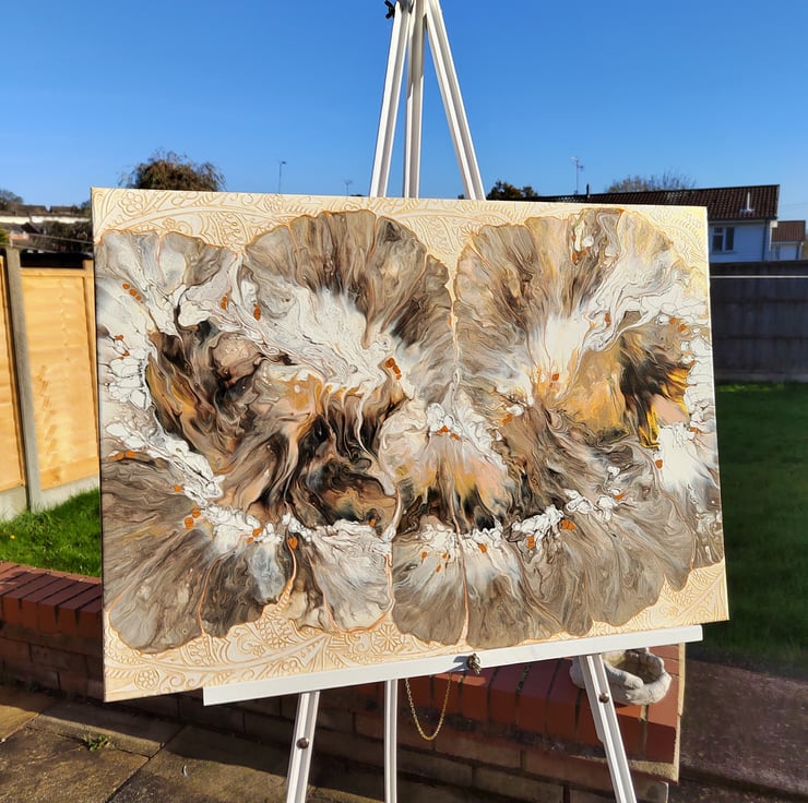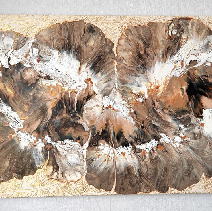 Original 50 x 70cm Brown and White Abstract Flowers, Acrylic Painting Hand Poured and embellished with 3D gold background- Wall Art, Perfect for Home or Office Decor.