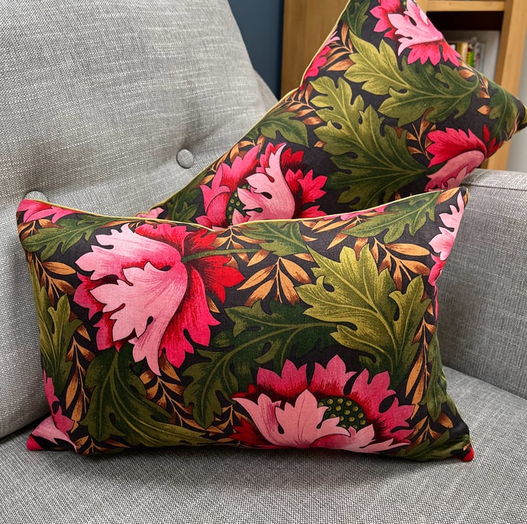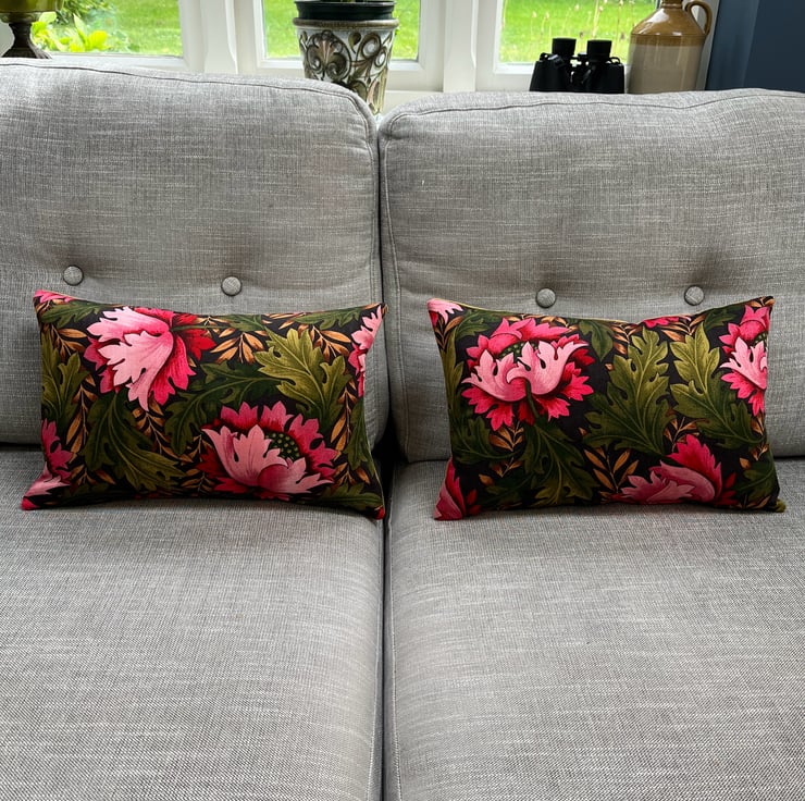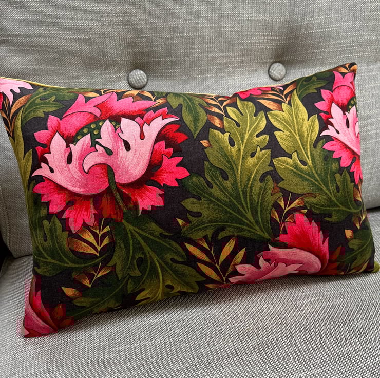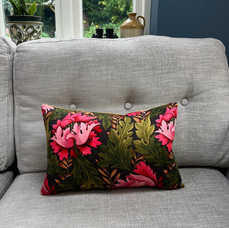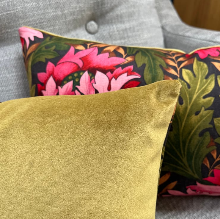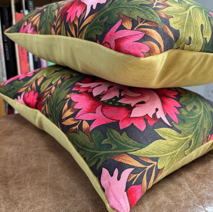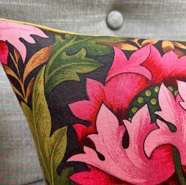 Beautiful floral cushion cover in vintage Cravendale Alpine sateen fabric with a subtle metallic sheen. Bright pink blooms shine out from the deep green leaves. It is backed with soft olive green velvet .