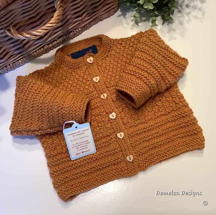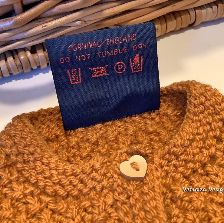 Baby knitwear is designed and hand crafted by Demelza Designs in Cornwall meeting UK baby safety standards, Only branded premuim acylic, acrylic/natural fibre blends or pure natural fibre yarns are used in baby knitwear which conforms to BS984/76 standards.