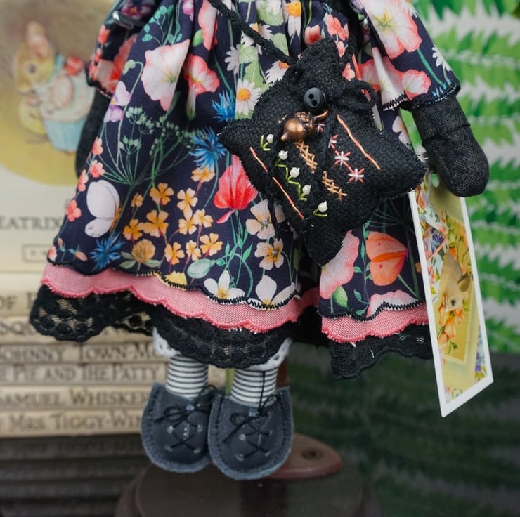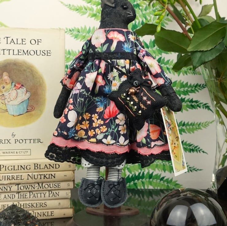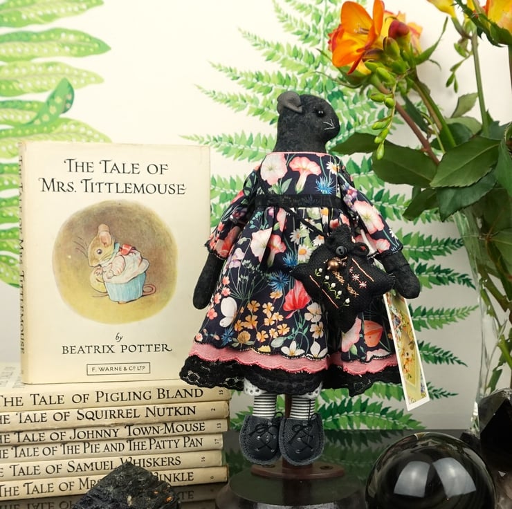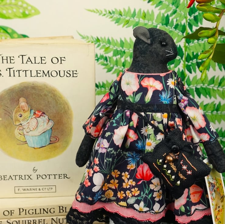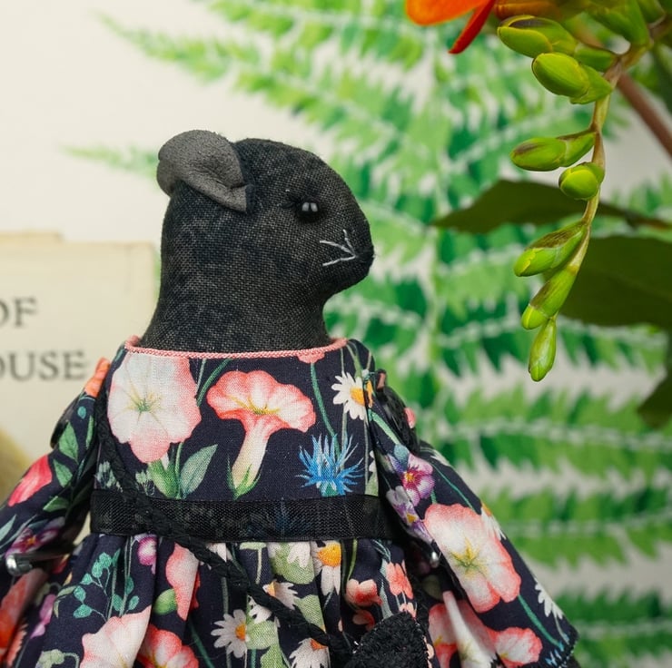 This is Judith, a tiny midnight mouse. She is a hand embroidered mouse with little leather ears and tail. She is dressed in a Liberty tana lawn cotton called Jude's Garden, the midnight version, a black ground with pencil crayon wild flowers in bright spring tones with a coral petticoat with black tulle mesh underskirt and white cotton lace bloomers. Her dress is finished with organza ribbon, tiny buttons and little leather shoes. She is a black mouse with black ears and tail, grey whiskers and an embroidered black nose.