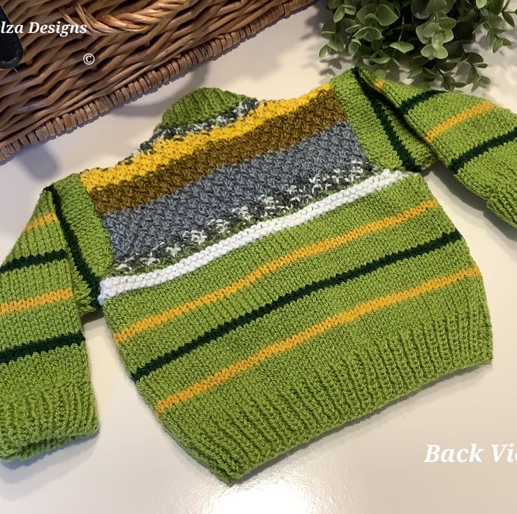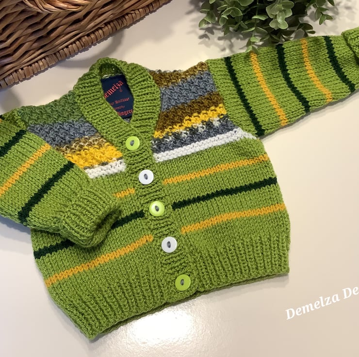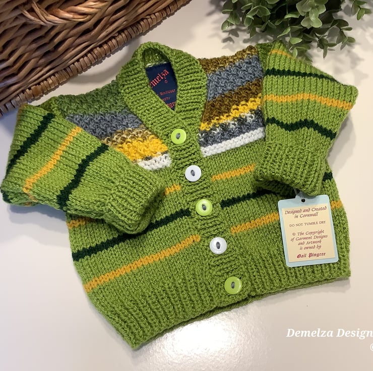A unique eye catching practical baby cardigan for either sex designed and totally hand crafted using quality branded machine washable yarns. The buttons are flat shape alternating in the garments colours for added design detail. The branded Demelza Designs garment label is attached to the back neck edge with the care instructions woven within it on the reverse side for lasting reference. A Demelza Designs garment swing tag will be attached to the front prior to dispatch for a professional touch if gifting.