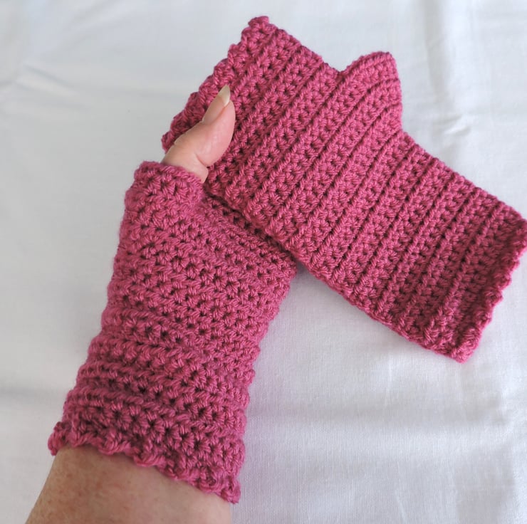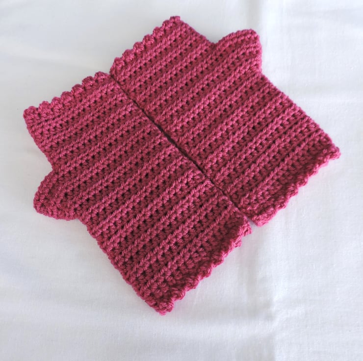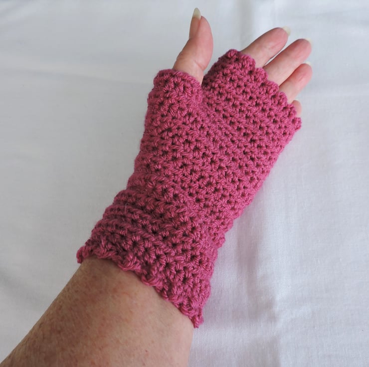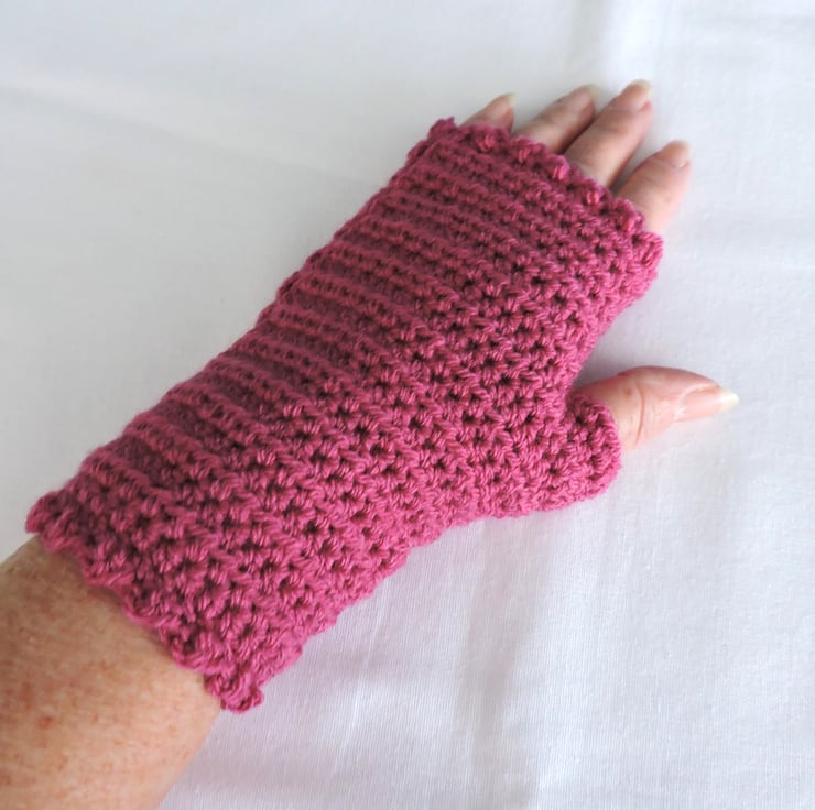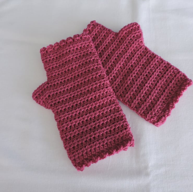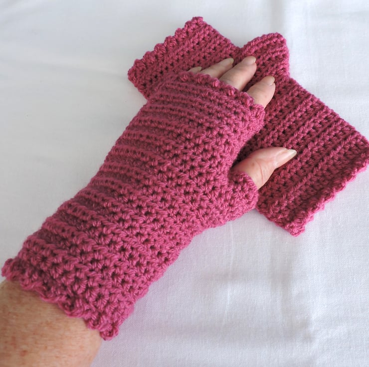 Fingerless mittens for adults in a lovely soft double knit acrylic yarn. Crocheted in a raspberry pink with a plain body and finished with a picot edge to bottom and top. A warm pair of mitts ideal for those who like to have their fingers free.
