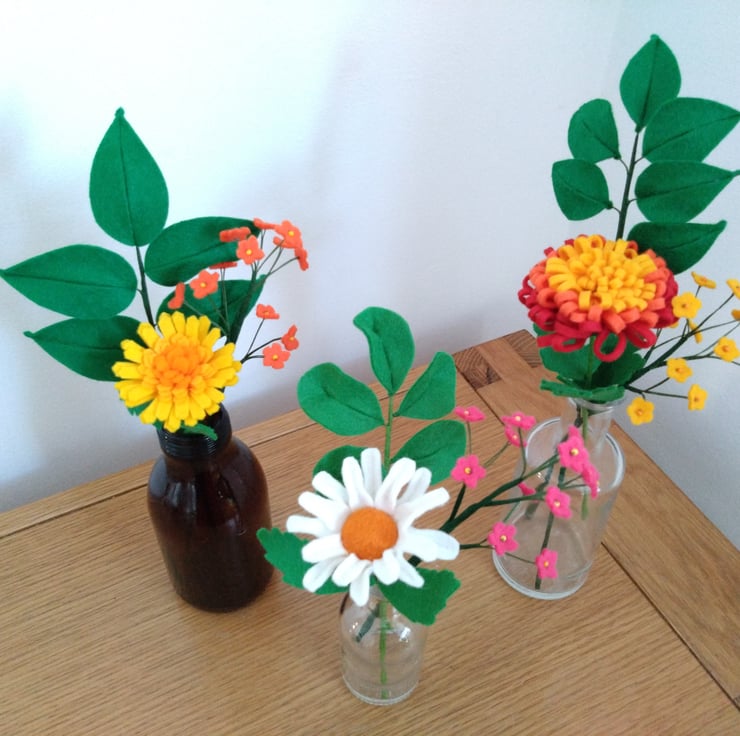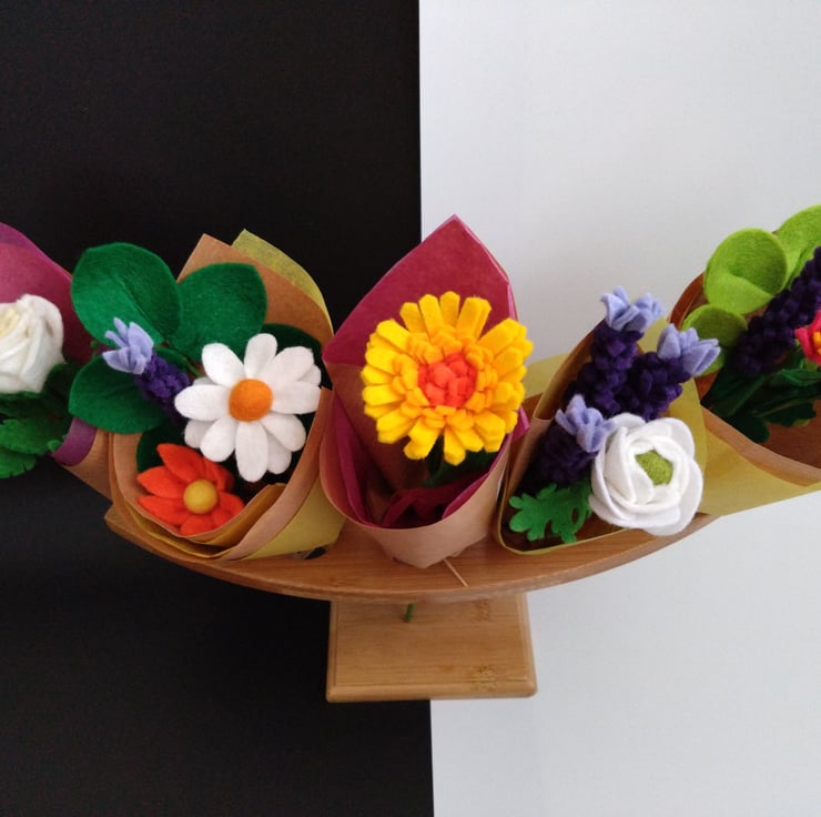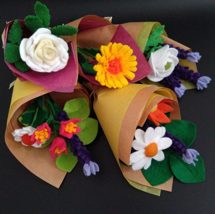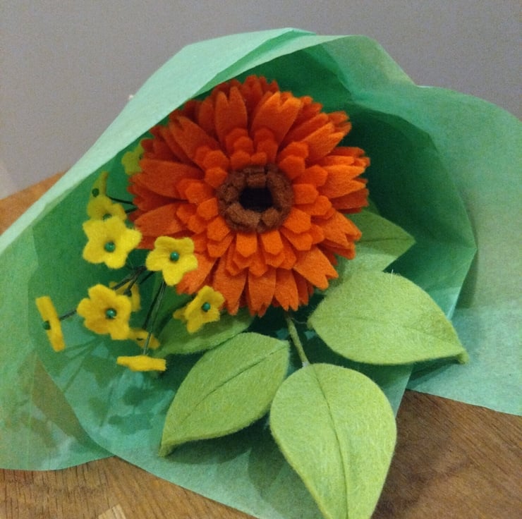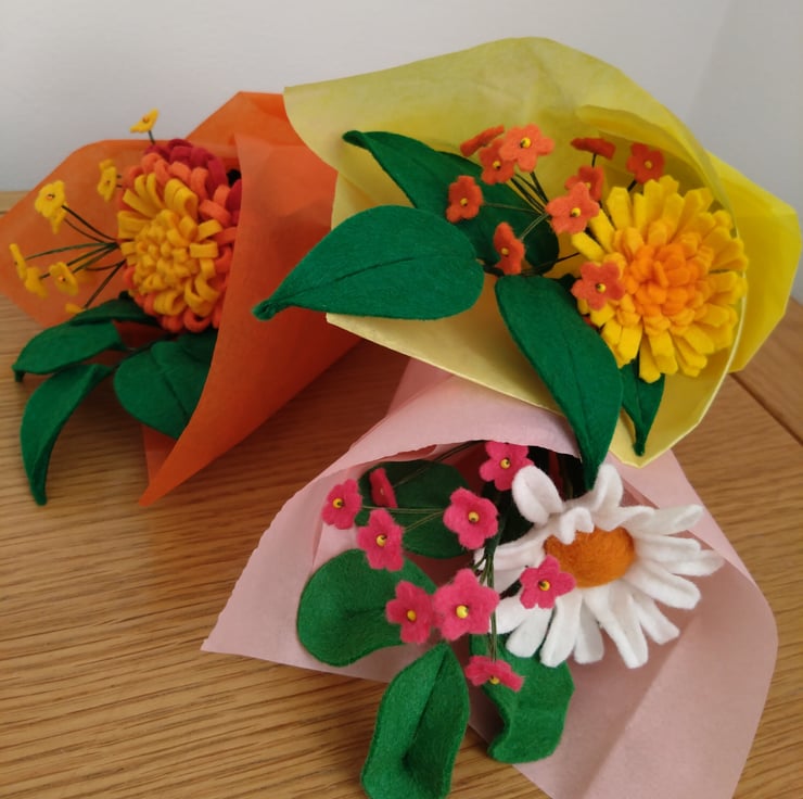 These felt flowers bouquets are a perfect gift for someone you love and care about. They will brighten mood and decorate any room for many years to come. Each bouquet contains one 'centrepiece flower', small flower filler and foliage wrapped in paper and finished with a ribbon. Since each bouquet is made to order you can choose type of flower, colour and wrapping to personalize it. Single flower option is also available. Please message me with your choice. You can also go for a 'Lucky Dip' option for convenience and surprise.