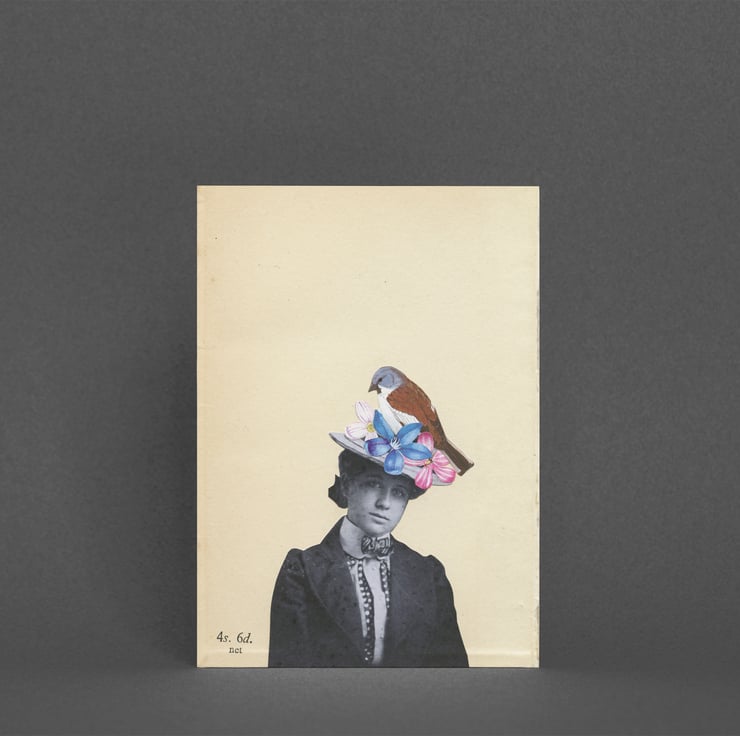 A victorian portrait greeting card featuring a beautiful woman wearing her floral headwear and her pet bird, Snow Finch. It's better to wear your pets so you can keep track of them.