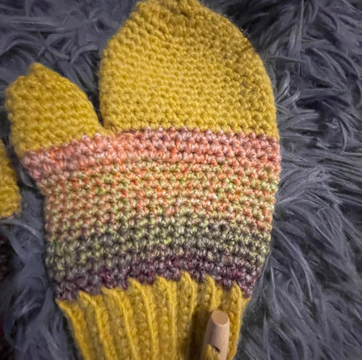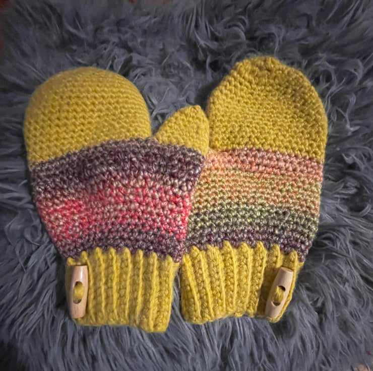 Beautiful crochet gloves using Leader of the Pac yarn (90% acrylic 10% alpaca) and James C Brett chunky marble.
