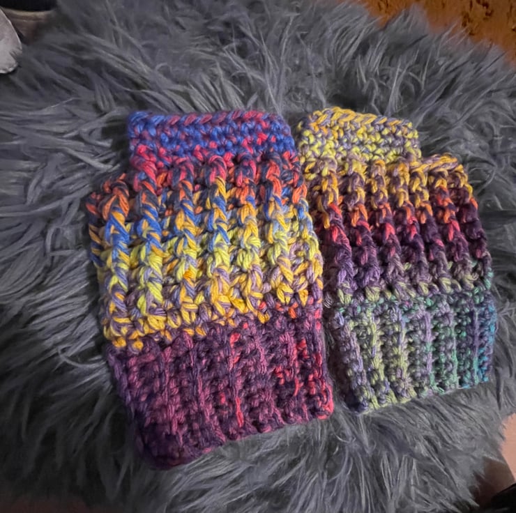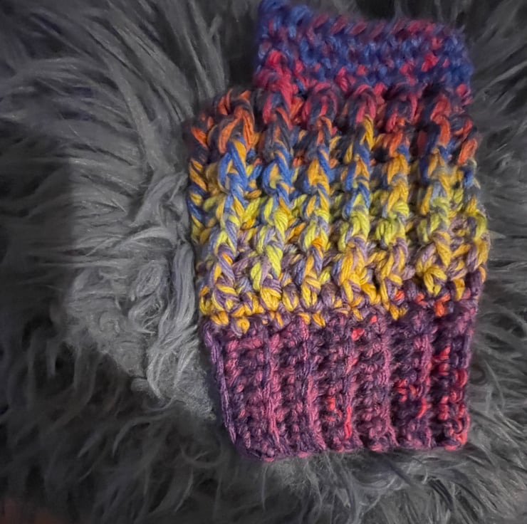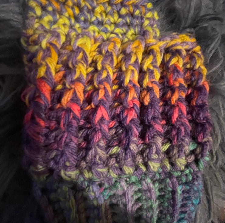 Crocheted with chunky Aran yarn with vibrant colour shading. Chunky and super warm.