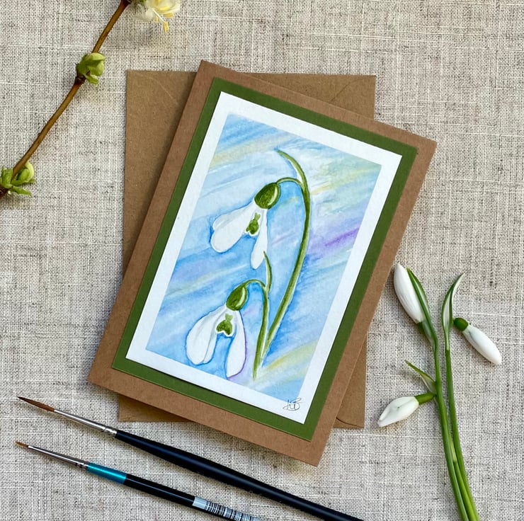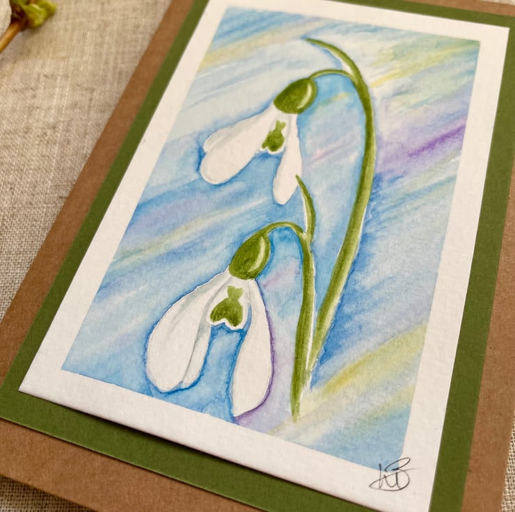 This blank greeting card features delicate snowdrops, hand painted in watercolour before being mounted onto a complementary olive green background border, it is left blank for any occasion and would make a lovely card for a January birthday, a snowdrop collector, or just sending a pretty note to a friend but could also be framed and put up on a wall.