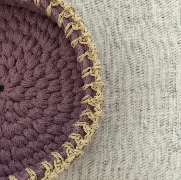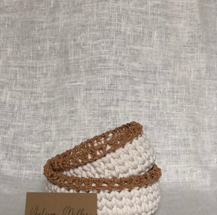 Small table basket. Made of cotton cord. Raffia rim makes it look a bit summer and boho.