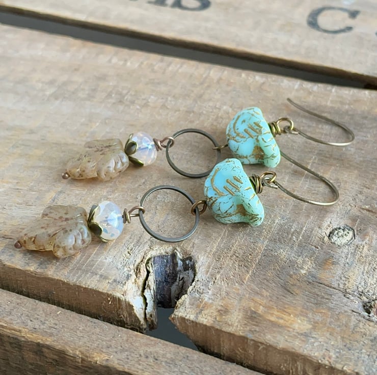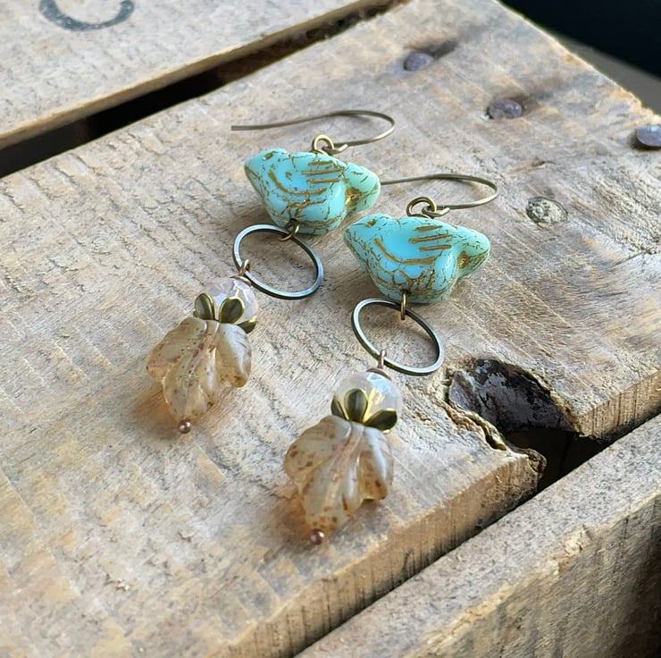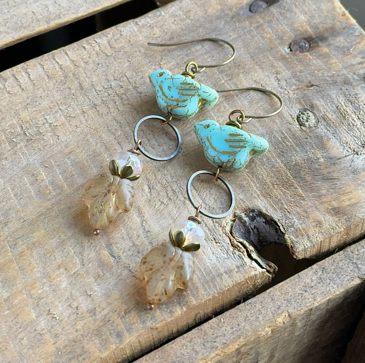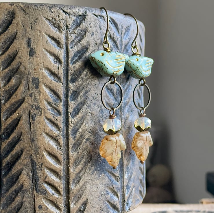 They feature whimsical Czech glass bird beads in a soft shade of mint green, with a rustic golden wash that highlights their features.