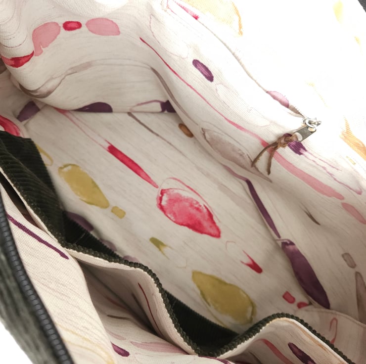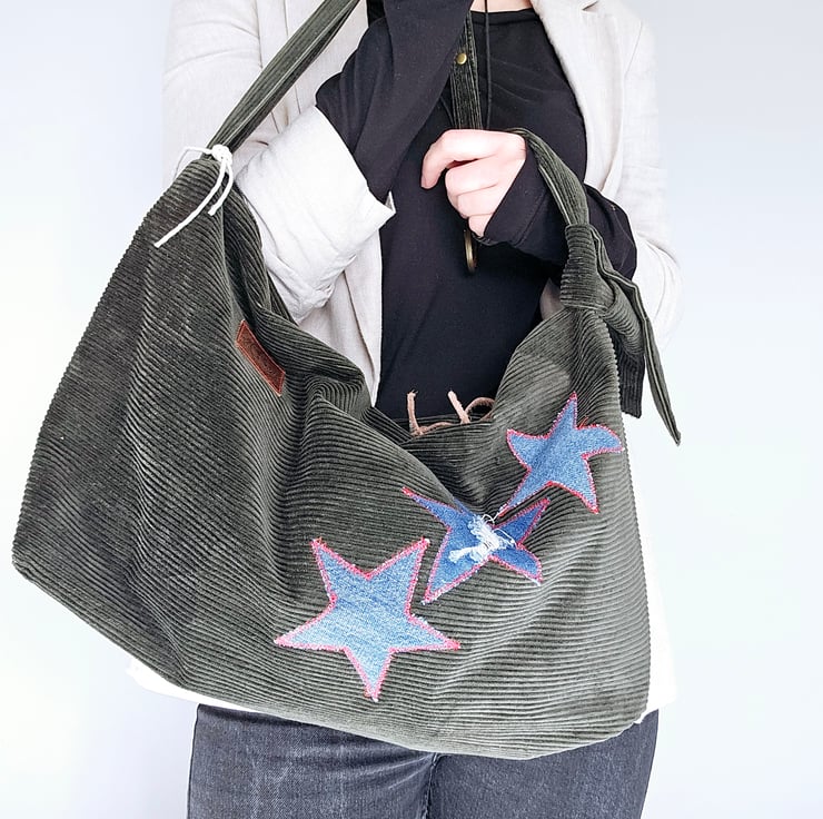 Introducing my stylish and functional dark grey-green corduroy handbag, designed for the fashion-forward individual.