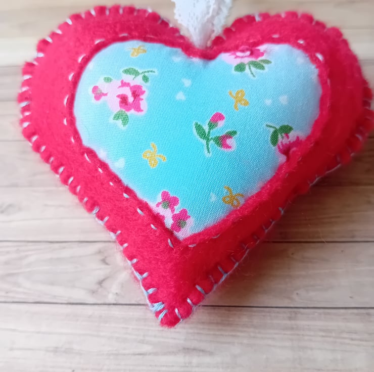 This sweet red felt heart, with a shabby chic fabric insert, and blue lace ribbon for hanging, would make a lovely gift for any occasion including Valentines, Mother's Day and nursery room