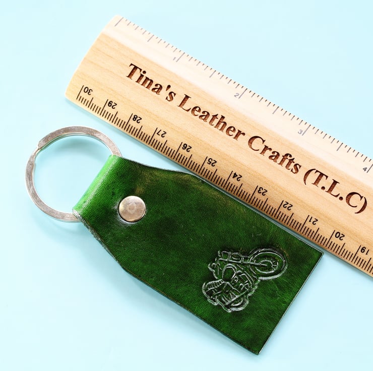 These Motorcycle leather keyring is made from premium quality leather and hand-dyed green on the front and on the reverse.