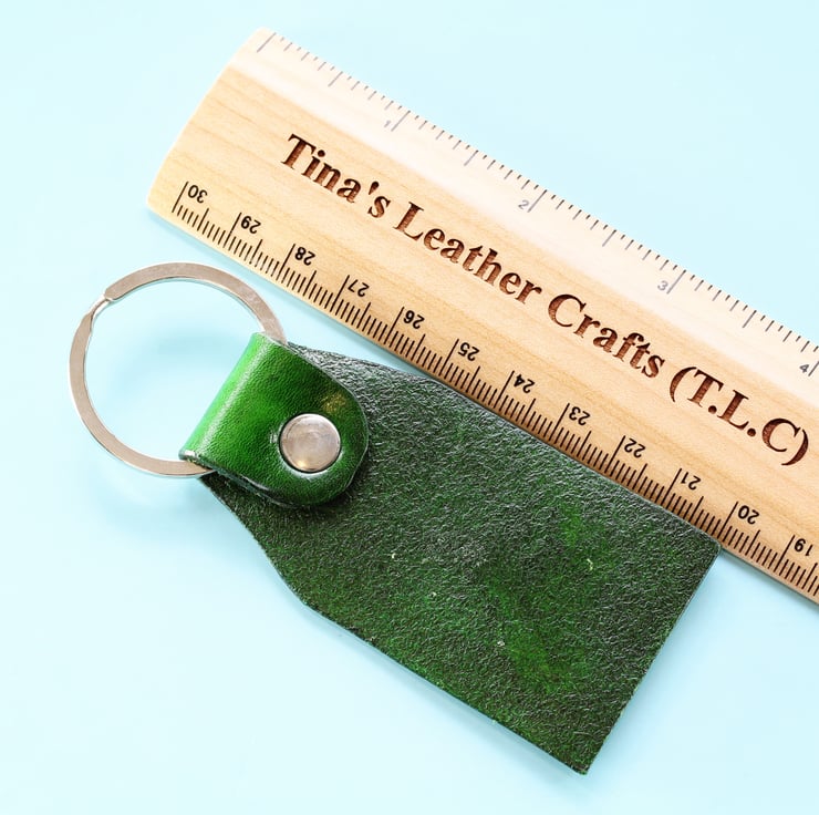 The leather key fob is approximately 7.7 cm long and around 3.9 cm wide. The overall length of the leather keyring is approximately 10.2 cm long including the ring. Exact shade of colour may vary as individually made by hand.