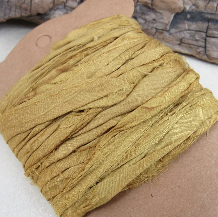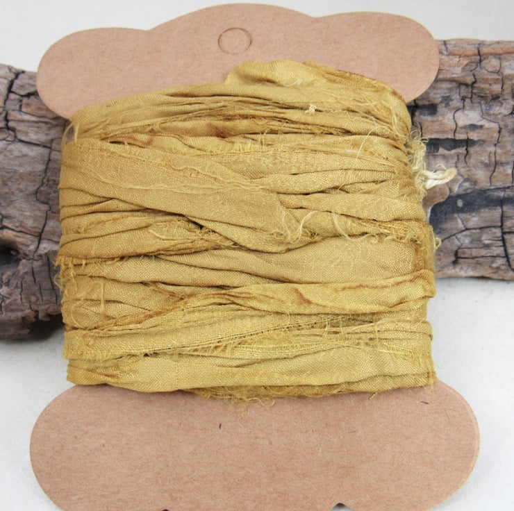 Hand dyed sari silk ribbon, dyed with natural pomegranate dye to give a range of golden yellows.