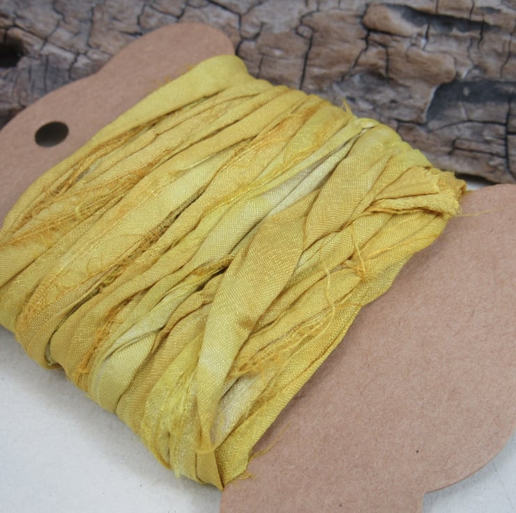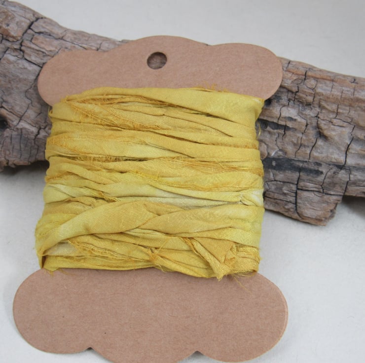 Hand dyed sari silk ribbon, dyed with natural weld dye to give a range of bright yellows.