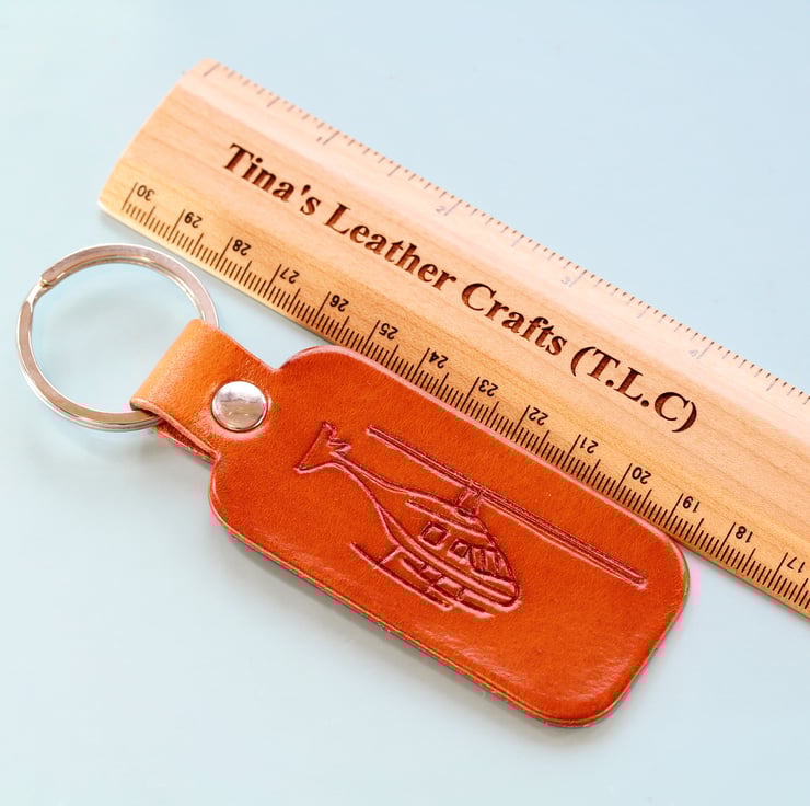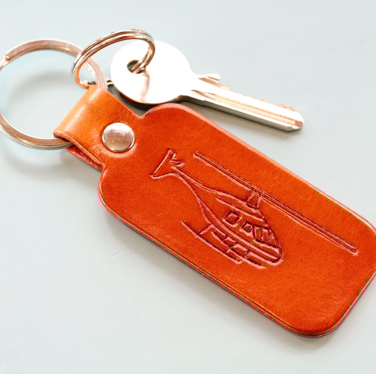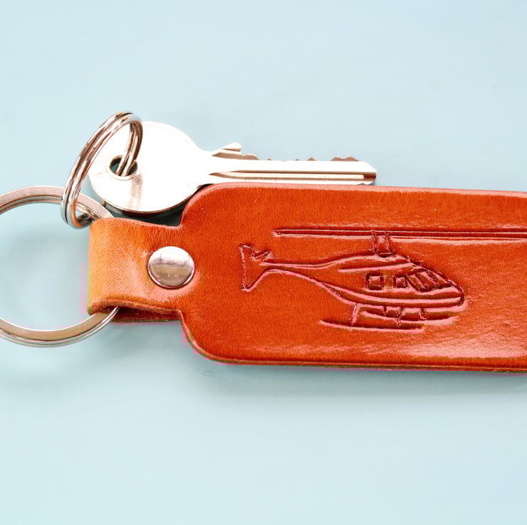 This Helicopter leather keyring has a hand-carved helicopter. The leather is hand-dyed brown on the front and on the reverse.