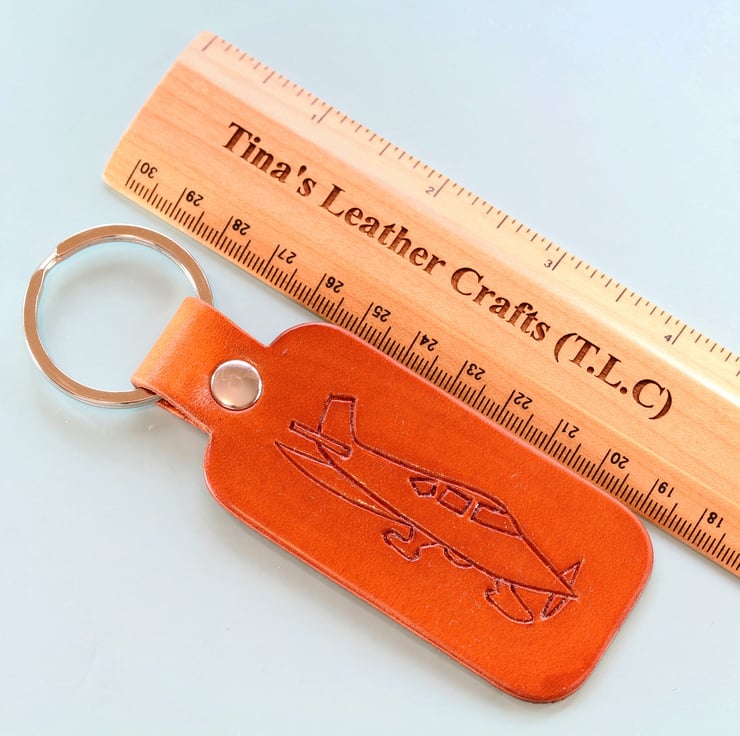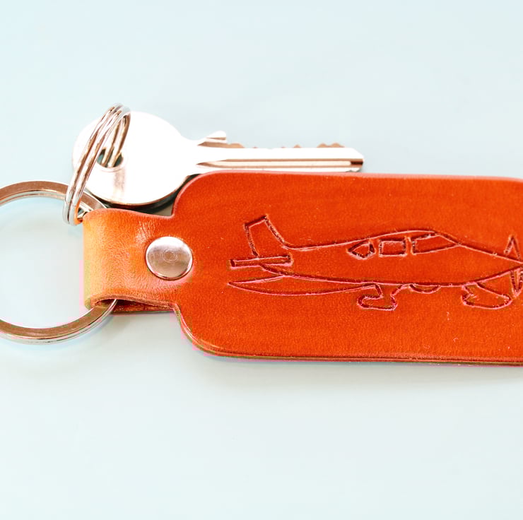 This hand-carved leather keyring has a hand-carved Cirrus plane. The leather is hand-dyed brown on the front and on the reverse.