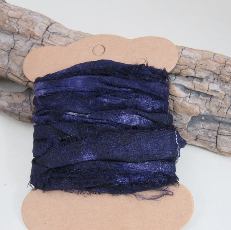 Hand dyed sari silk ribbon, dyed with natural logwood dye to give a range of dark purples