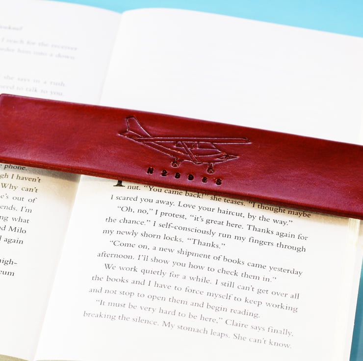 This personalised hand-carved leather bookmark has a hand-carved Cessna Plane and your choice of plane tail number, name or initials (max. 10 characters). The leather bookmark is hand-dyed brown on the front and on the reverse