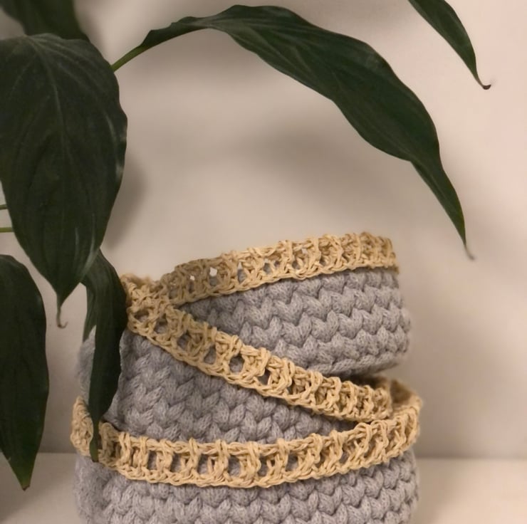 Small/medium/large table basket set. Made of cotton cord. Raffia rim makes it look a bit summer and boho.