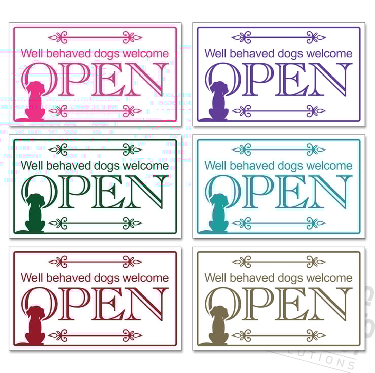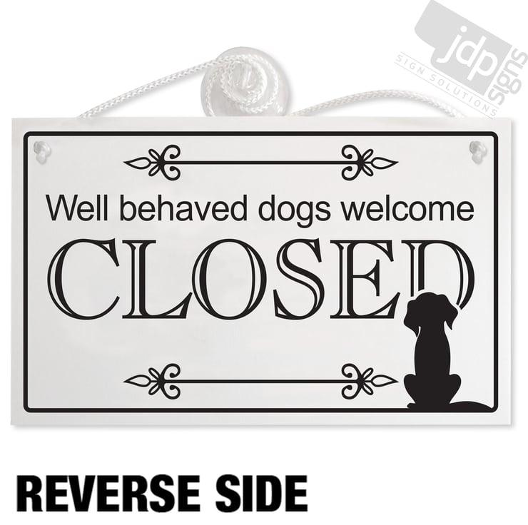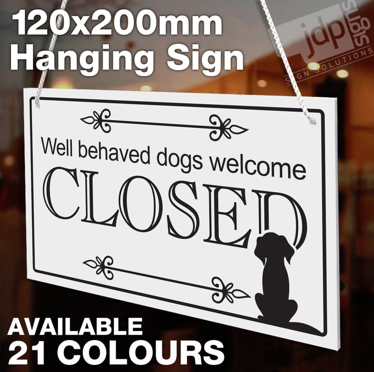 WELL BEHAVED DOGS ALLOWED OPEN & CLOSED RIGID HANGING SIGN, SHOP WINDOW DOOR - 21 COLOURS