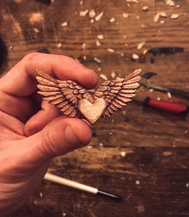The heart and wings are hand carved from lime wood and finished with wax polish.