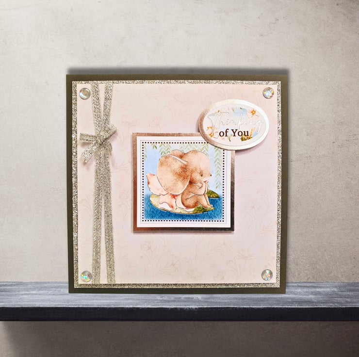 The card consists of mats of patterned cardstock & silver glitter card, layered on a smooth, grey card base. The central silver foiled topper displays a cute, thoughtful elephant, with the sentiment "Thinking Of You" placed on the top right corner.