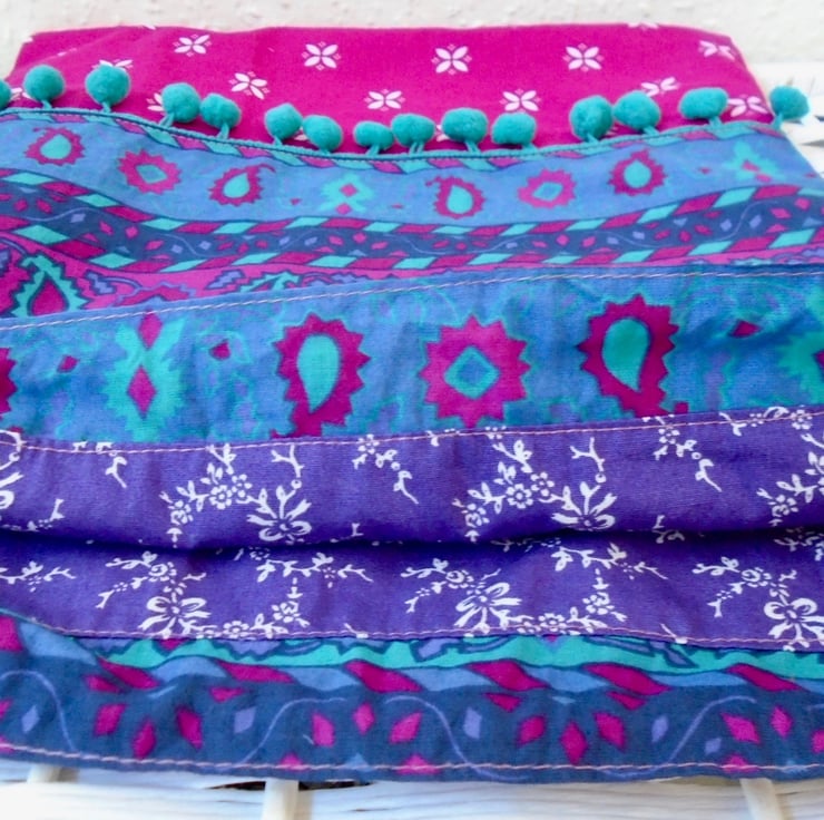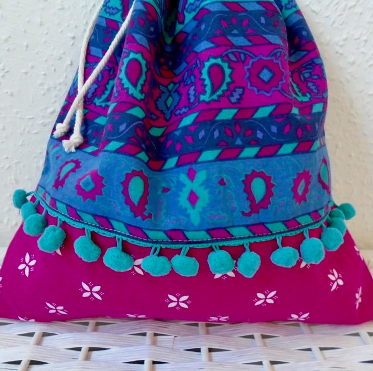 Made in a couple of lovely printed cotton fabrics , and embellished with a pom pom trim on the front