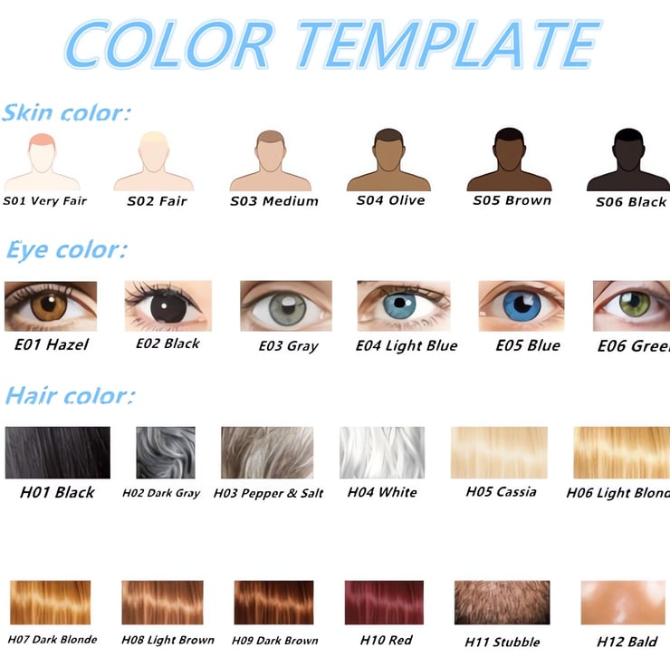 1. Please send me your photo through dialog box. The photo needs to show your face,clothing and posture. As well as skin color,eye color,and hair color choices (please follow the codes in the photo). We will produce according to your photos and requirements. After completing each step,I will send you a photo for confirmation. And we will make modifications based on your feedback until you are satisfied. However,please note that modifications cannot be made after confirmation.