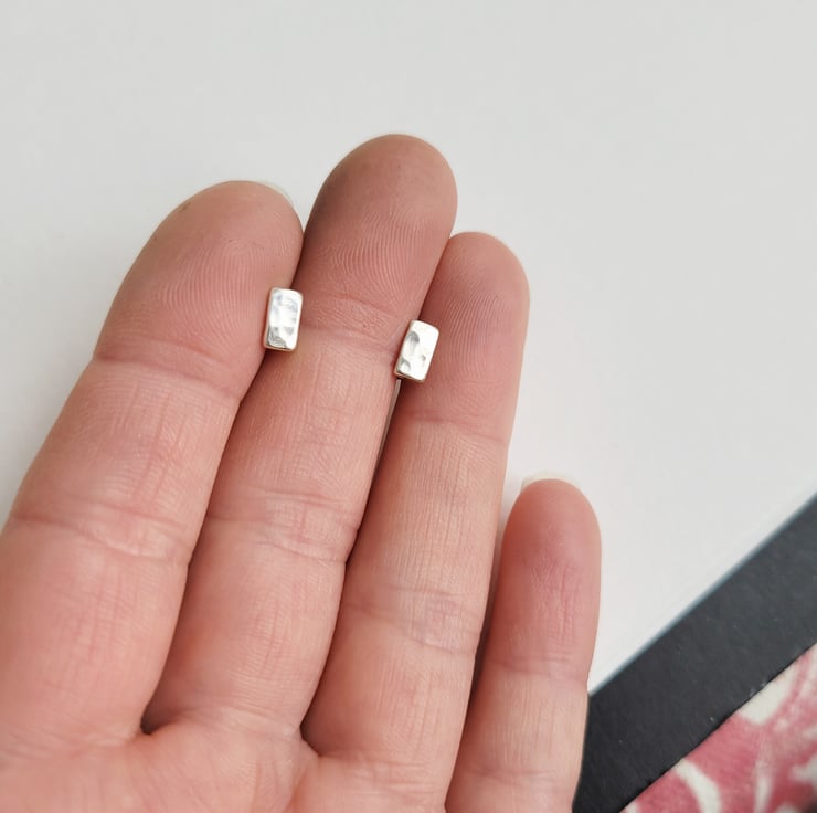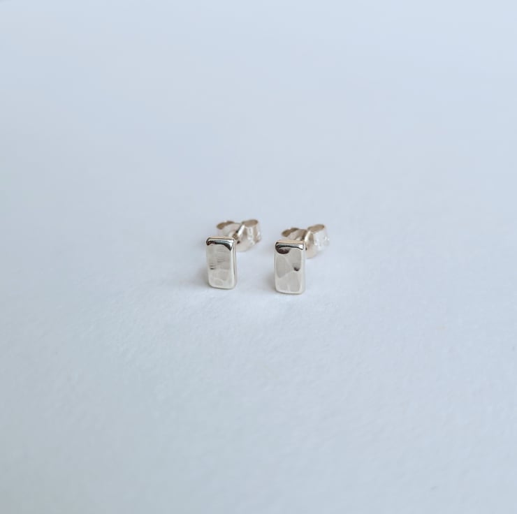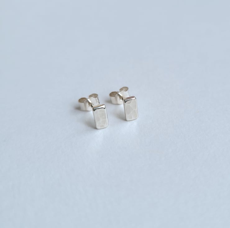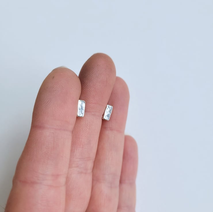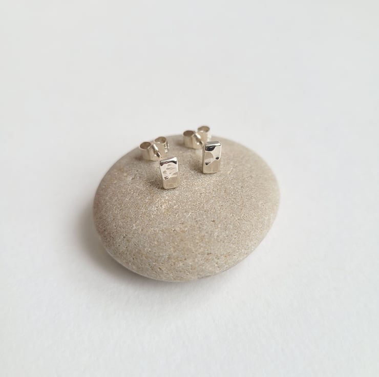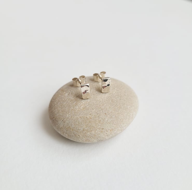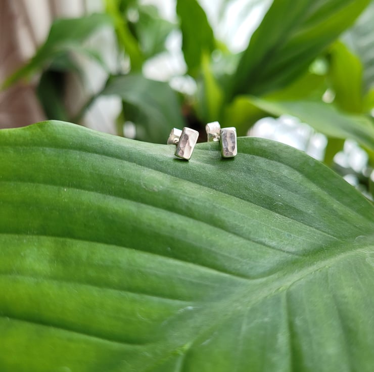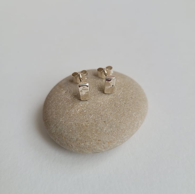Handmade by hammering small rectangular recycled sterling silver to create a dimpled texture. Sterling silver stud earring pins soldered onto the backs of the rectangles. Finished with sterling silver butterfly scroll backs.