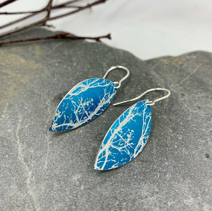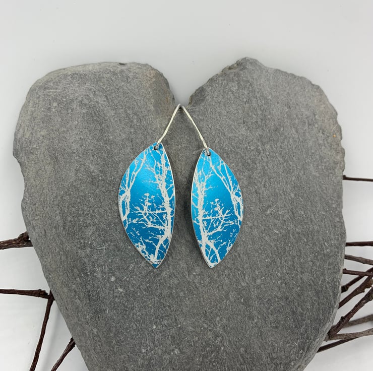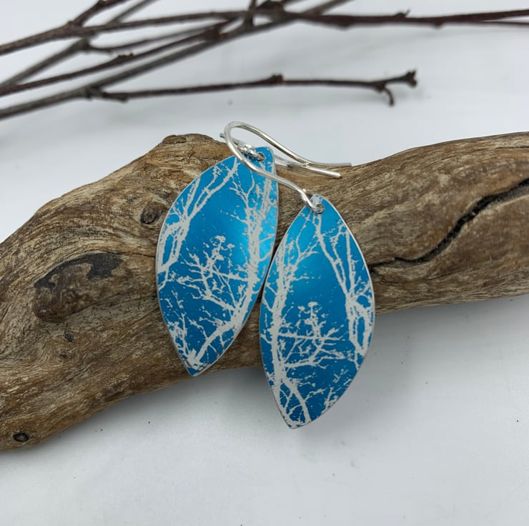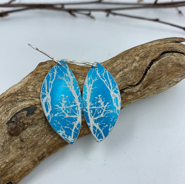 These lovely lightweight earrings are from my ‘Winter Trees’ collection. The offset oval shape has been dyed turquoise and domed. They were then laser etched with a tree design taken from a photo that I took of winter trees.