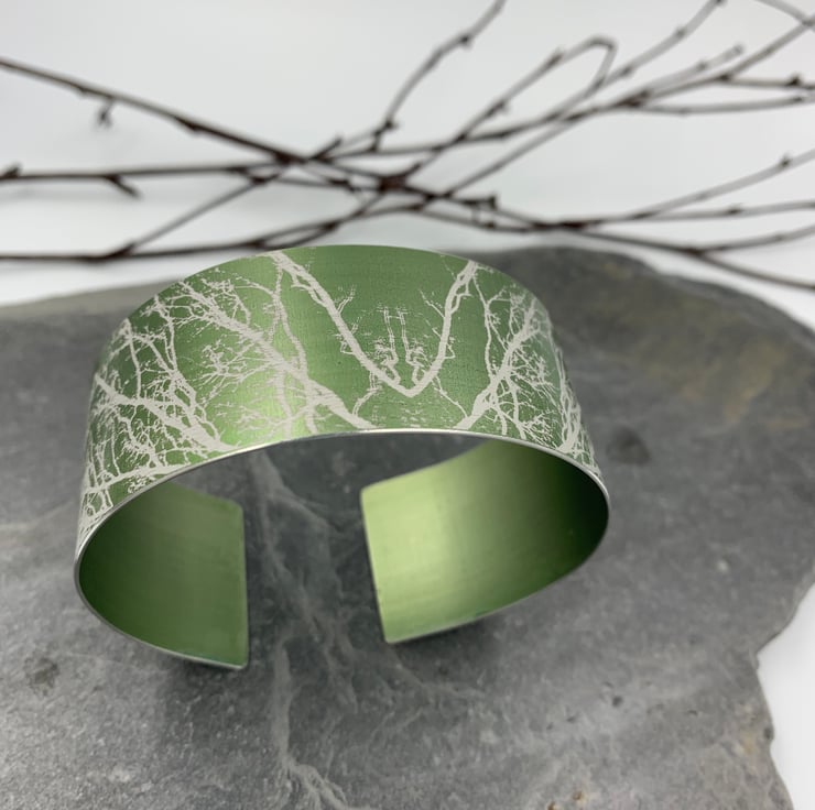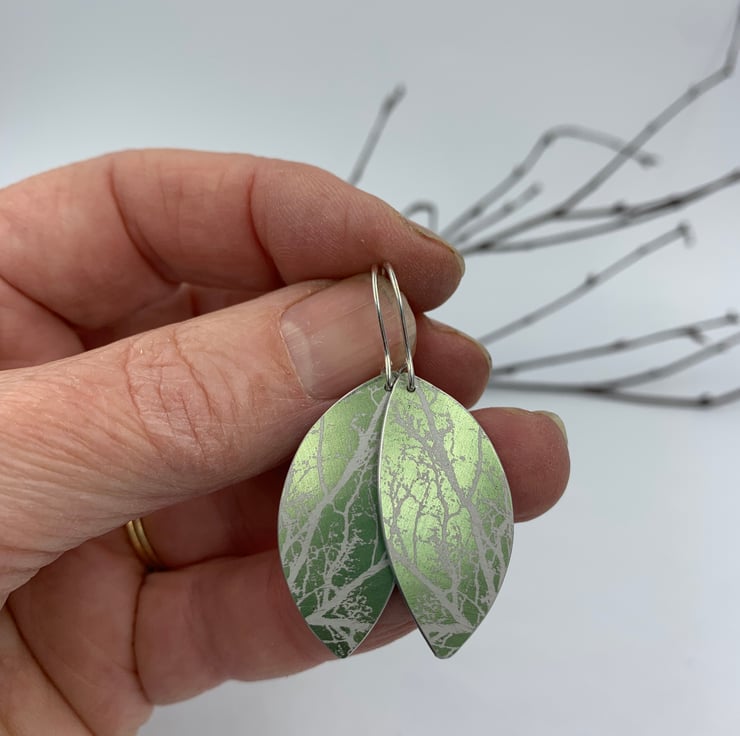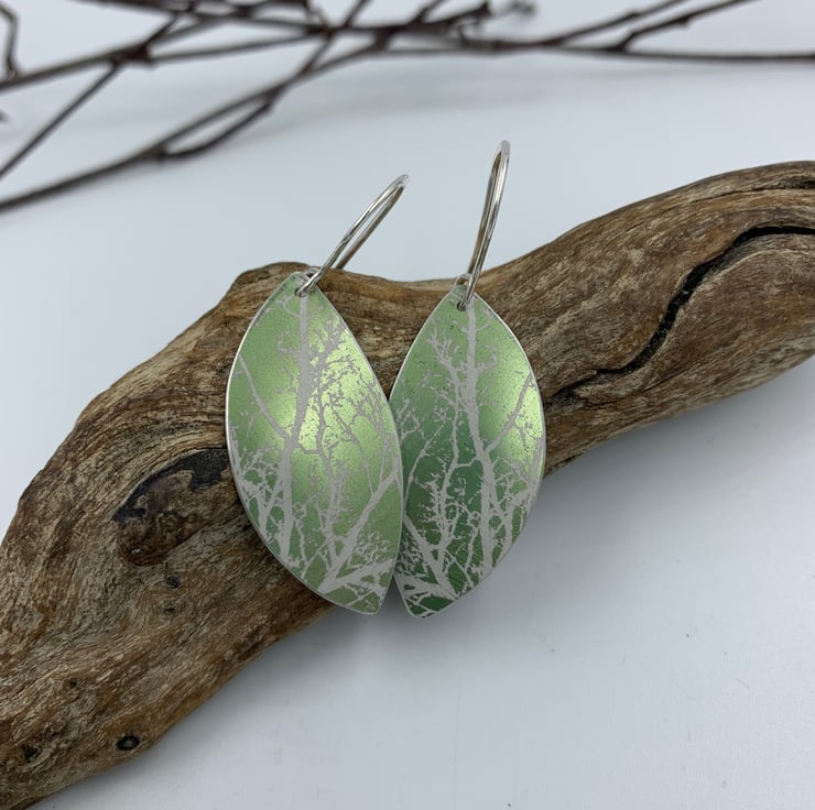 These lovely green aluminium earrings are from my ‘Winter Trees’ collection. The offset oval shape has been dyed sage green and domed. They were then laser etched with a branches pattern taken from a photo that I took of a local tree in winter.