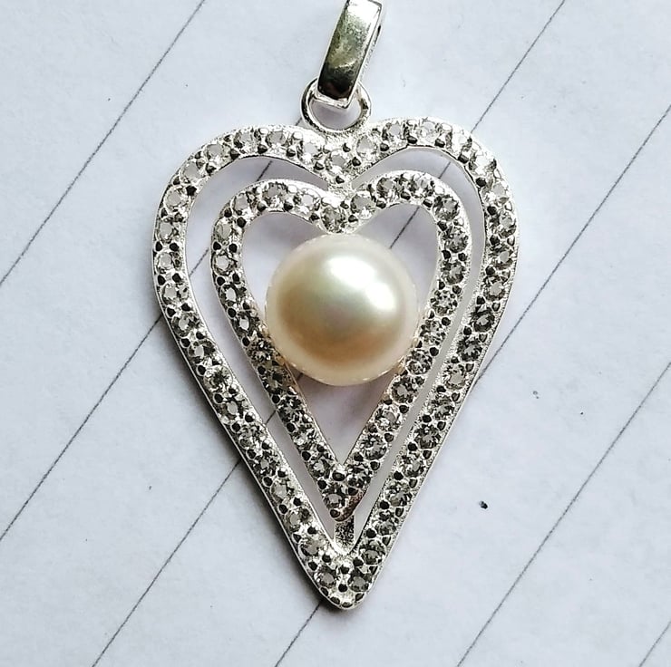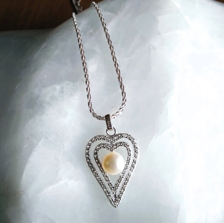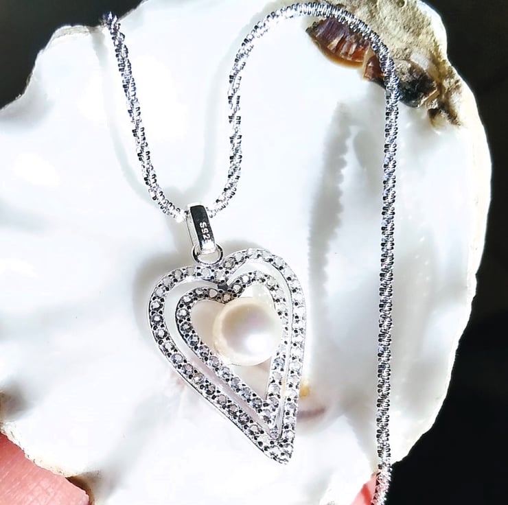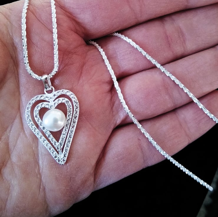 A stunning, intricately crafted 925 Sterling Silver 18 inch cauliflower chain, 1.2 mm wide and 2.5g weight. The Cauliflower chain resembles a textured rope made up of clusters of tiny super reflective elements of sterling silver, making this a unisex style and a chain that will get you noticed. This chain will add a stylish, elegant eye catching sparkle to any outfit and beautiful for a minimalist bridal necklace that will stand out. To complete the chain add the gorgeous large 20 x 30mm heart pendant with its 8x7mm white freshwater pearl and 60 x 1mm white Topaz semi precious gemstones to finish off the sparkle to this set.