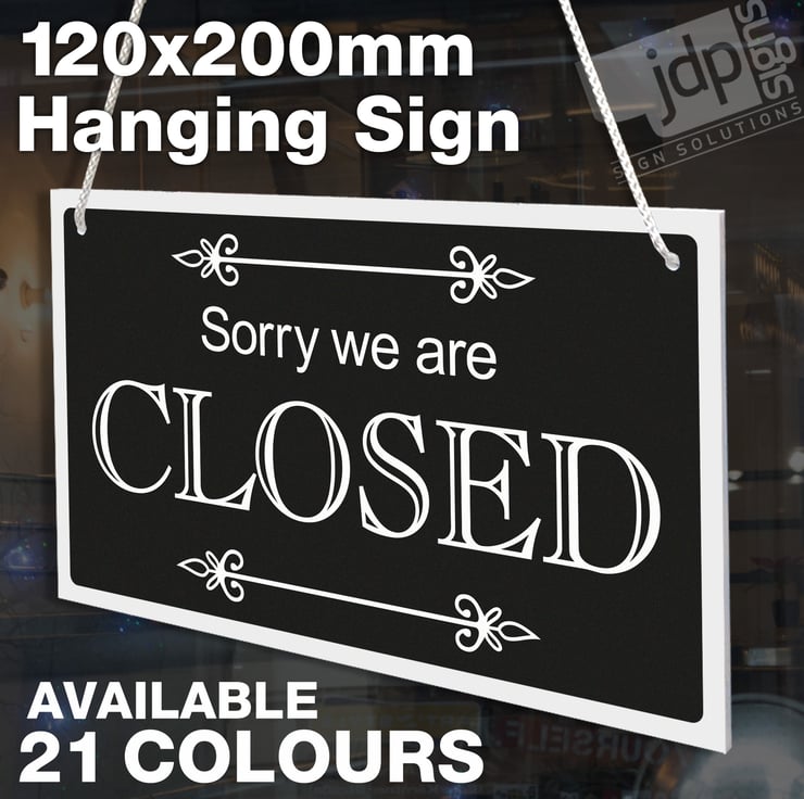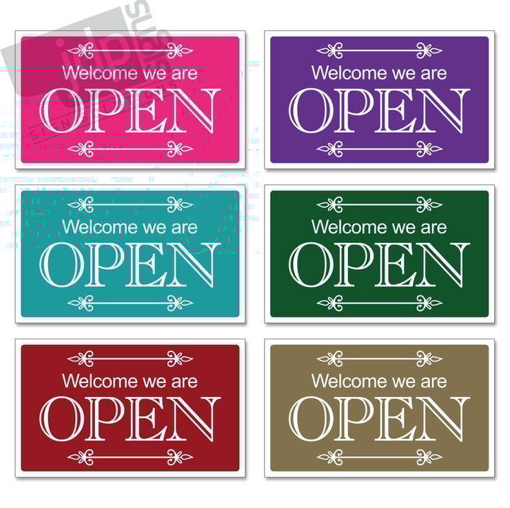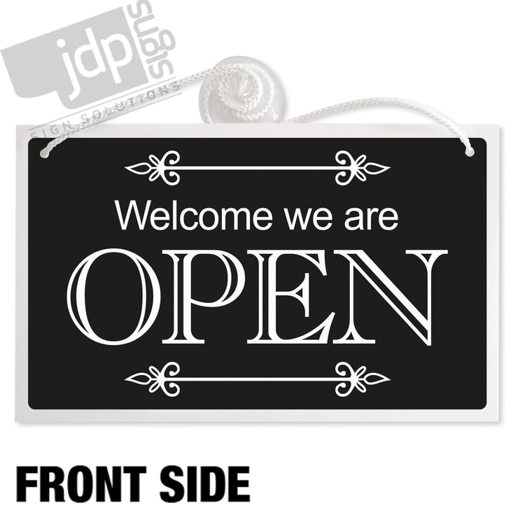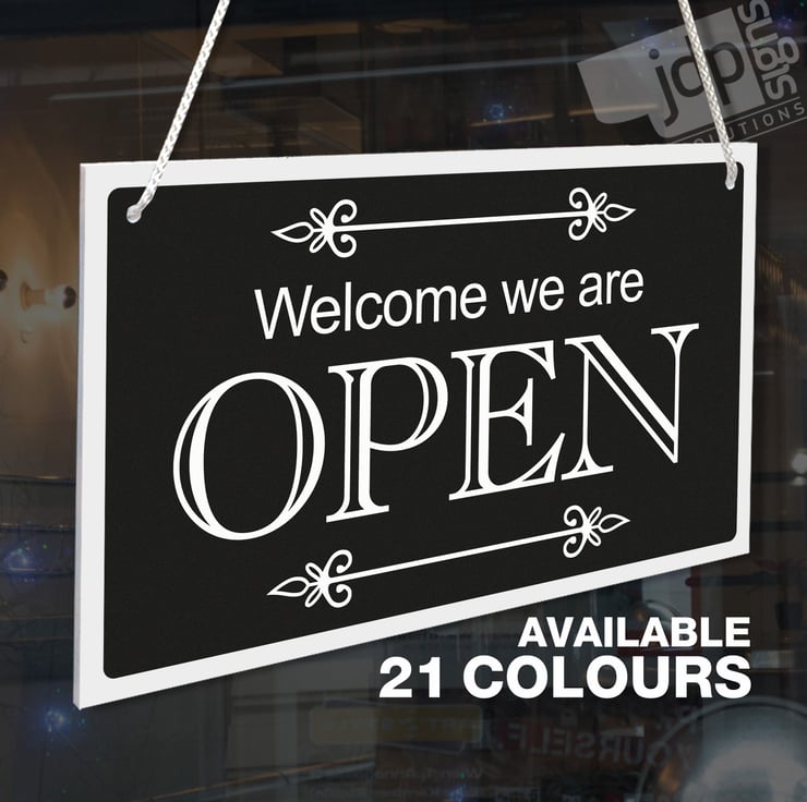 WELCOME WE ARE OPEN AND SORRY WE ARE CLOSED DOUBLE SIDED RIGID HANGING SIGN, SHOP WINDOW DOOR - 21 COLOURS