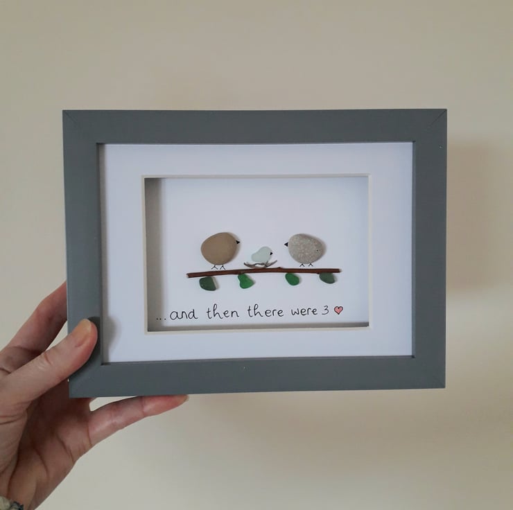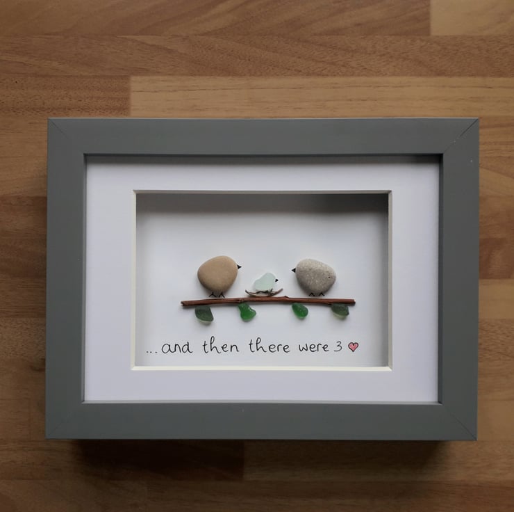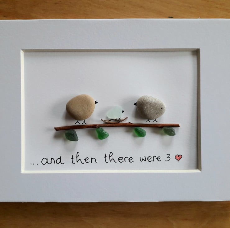 Sea Glass & Pebble Art - Unique new baby gift of genuine sea glass and pebbles for first time parents - "and then there were 3" - depicts 2 pebble birds on a branch with a cute sea glass baby in the leafy nest. The beach finds are hand picked by me from Seaham, England. What you see is what you will receive.