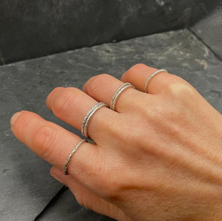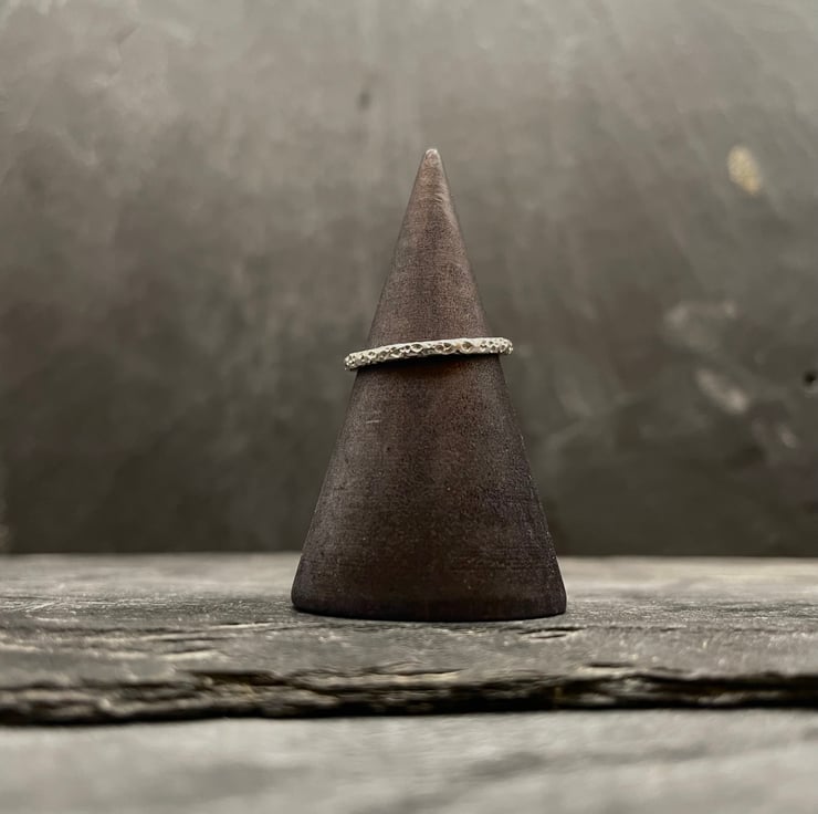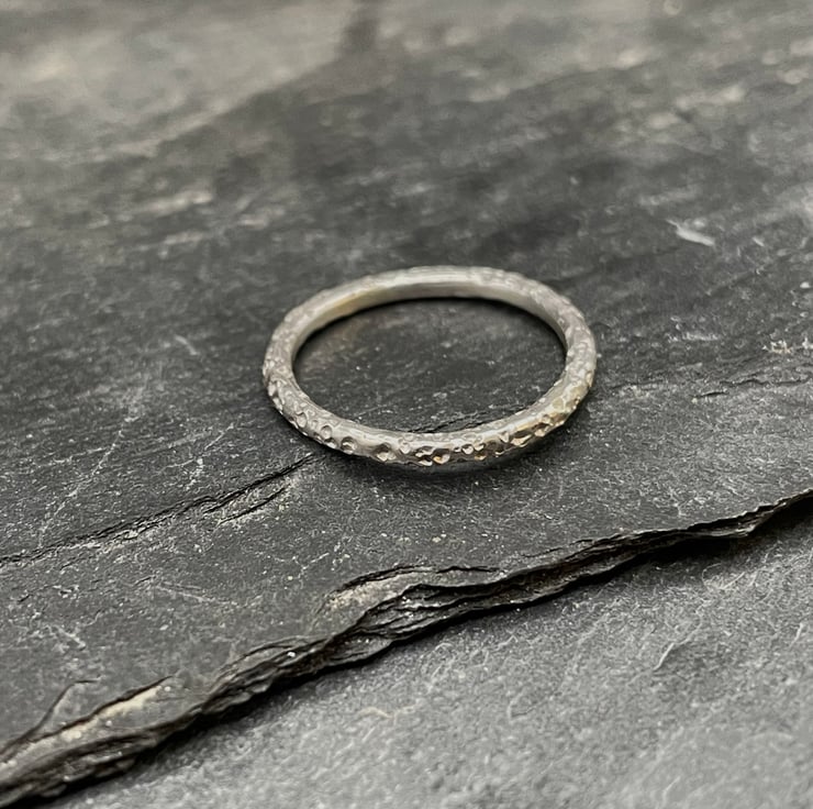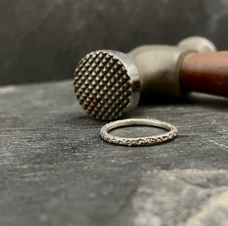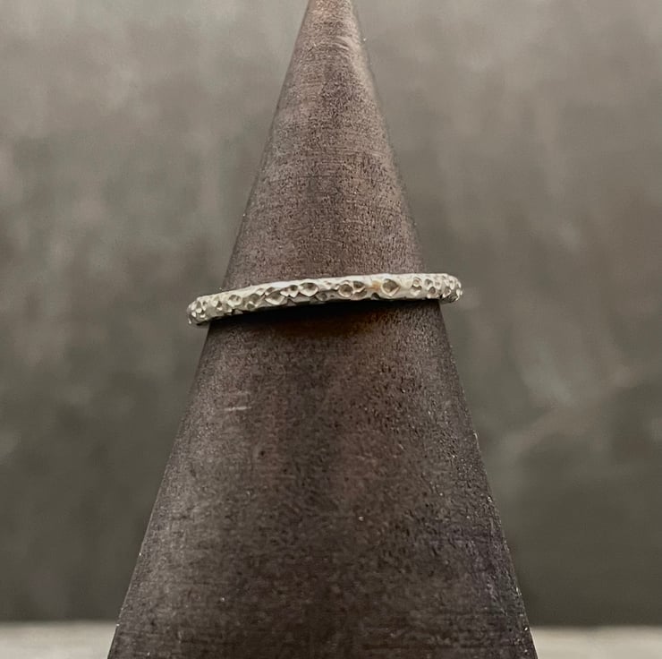 Fine sterling silver ring. Hand hammered with a “stippled”effect. Can be worn as a single simple ring or in combination with other stacking rings for more of a statement.