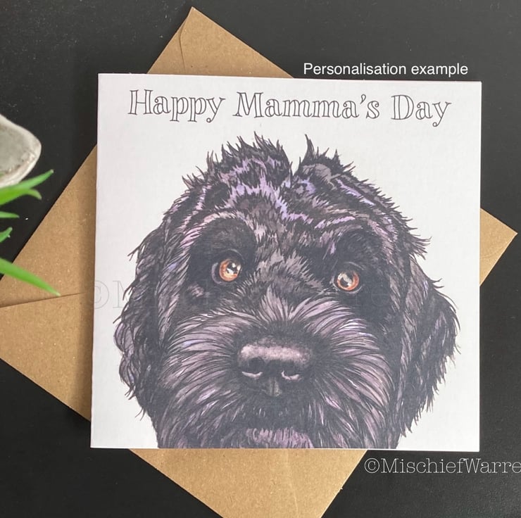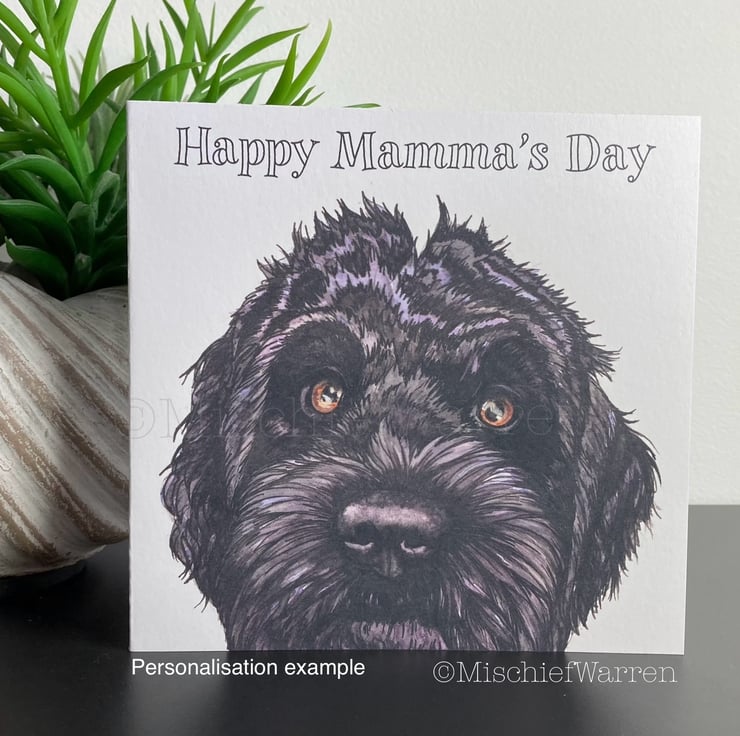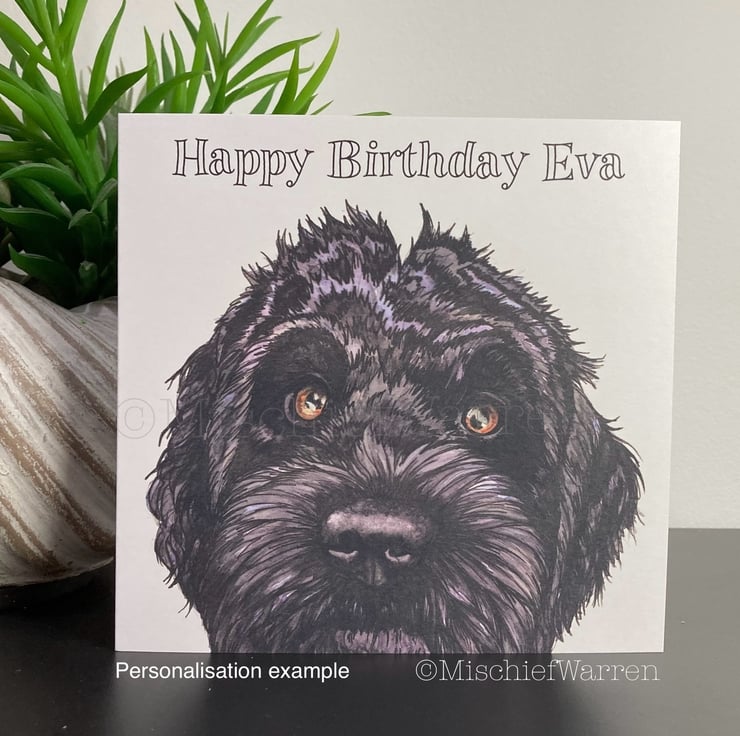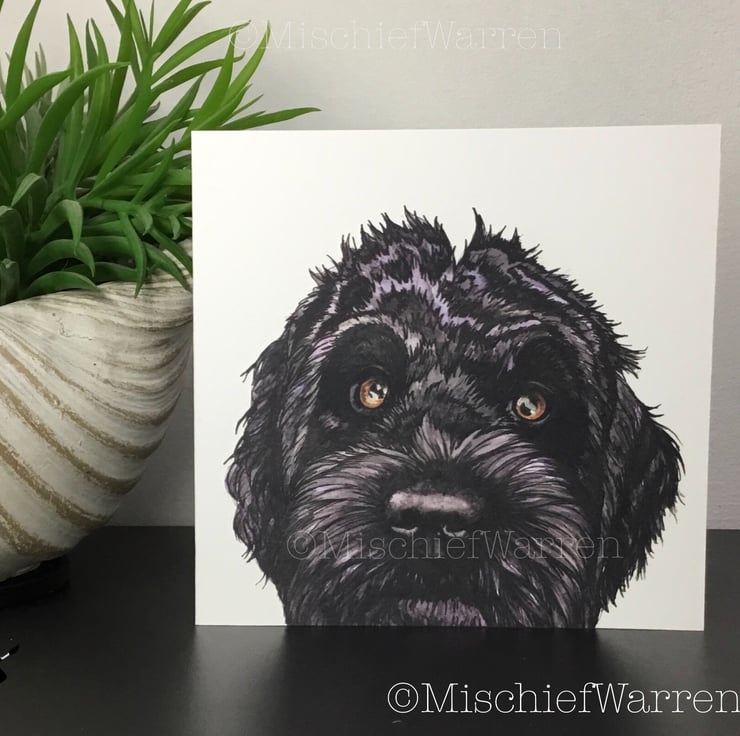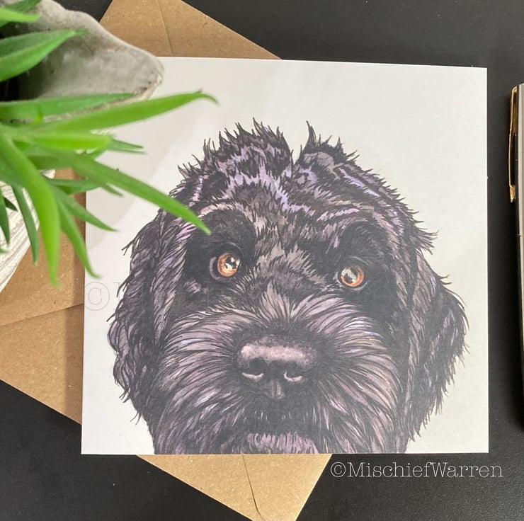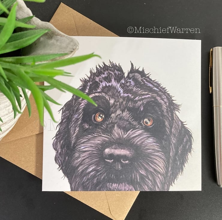This cockerpoo or doodle card features a print of my ink and watercolour illustration of a black cockapoo or labradoodle. Designed, hand drawn, hand painted and printed by me. Can be personalised for any occasion; birthday, Easter, Valentine’s day, Mothers Day, Fathers Day, Thank you, Congratulations or Christmas perhaps. I like “Did someone say cake?” which covers any celebration involving cake including retirement and wedding. Blank inside, or I can add your message and/or send direct to the recipient.