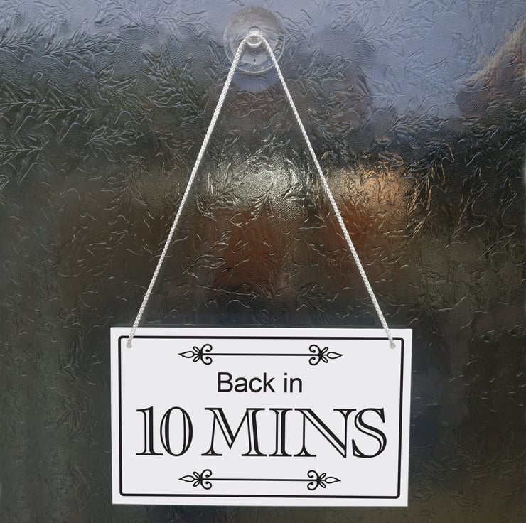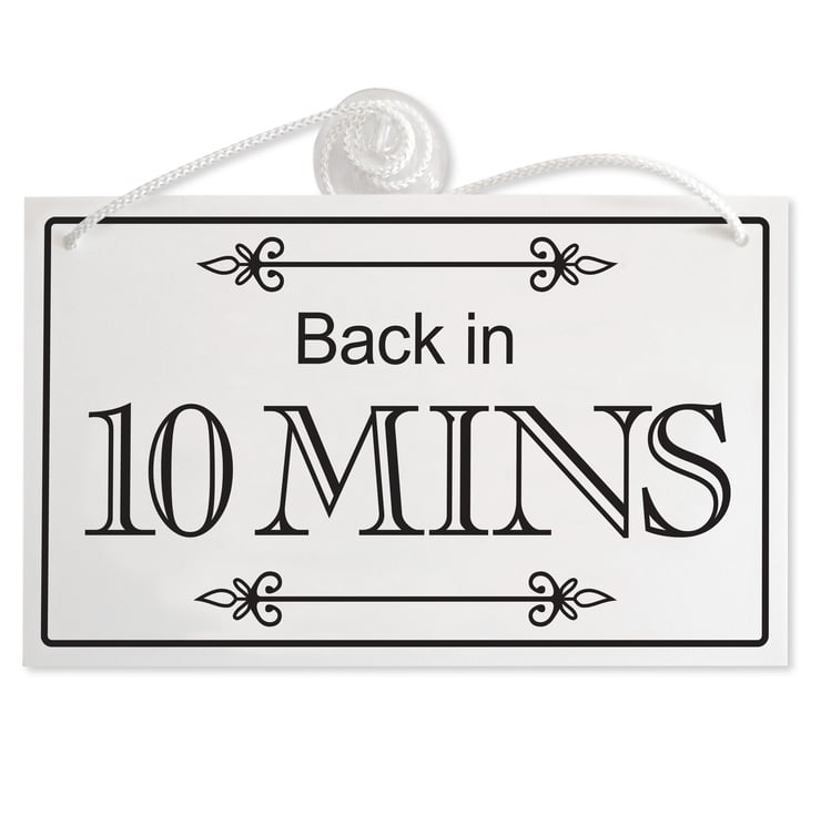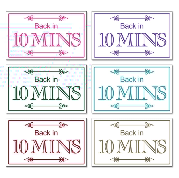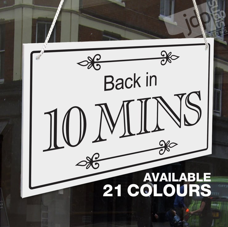 BACK IN 10 MINS RIGID HANGING SIGN, SHOP WINDOW DOOR - 21 COLOURS