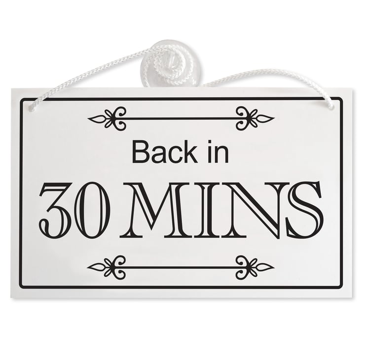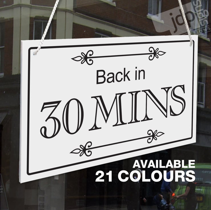 BACK IN 30 MINS RIGID HANGING SIGN, SHOP WINDOW DOOR - 21 COLOURS