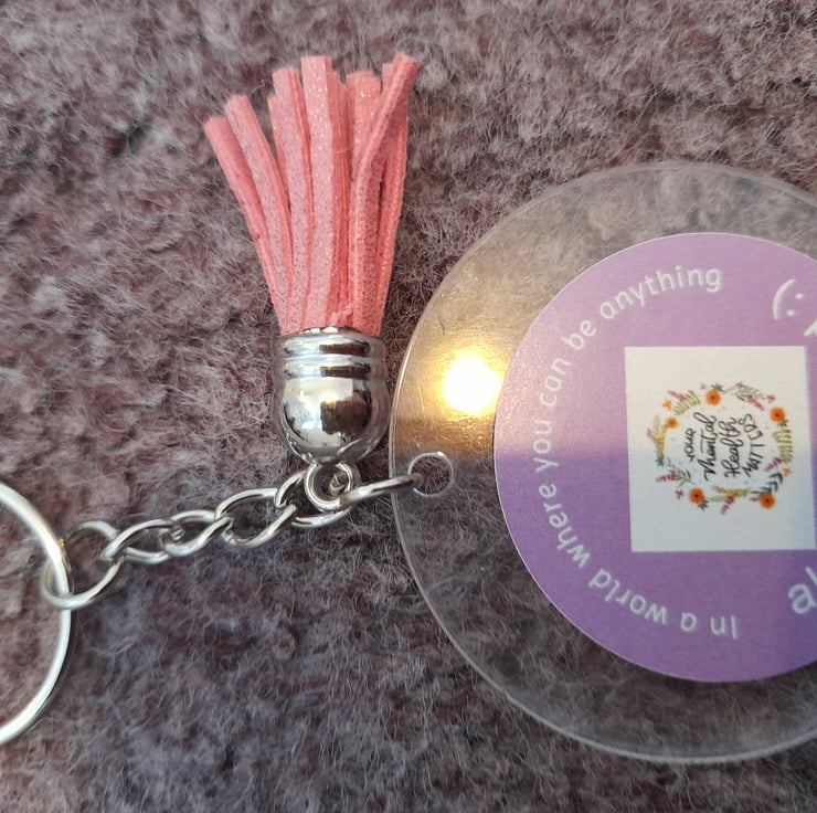 Mental health keyrings handmade, showing a message of kindness and support with a tassel attached. Aimed to promote and raise awareness of mental health.