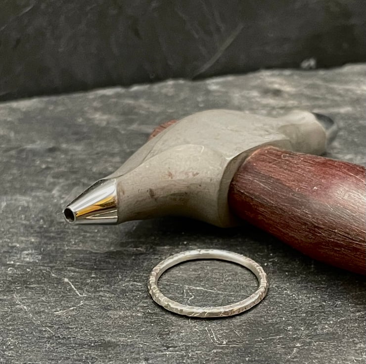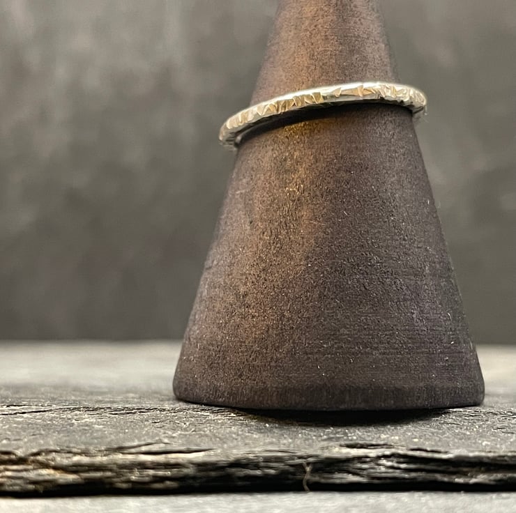 Fine sterling silver ring. Hand hammered with a “faceted” effect. Can be worn as a single simple ring or in combination with other stacking rings for more of a statement.