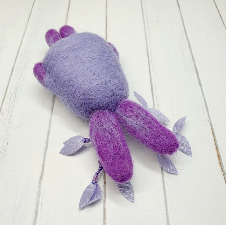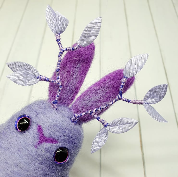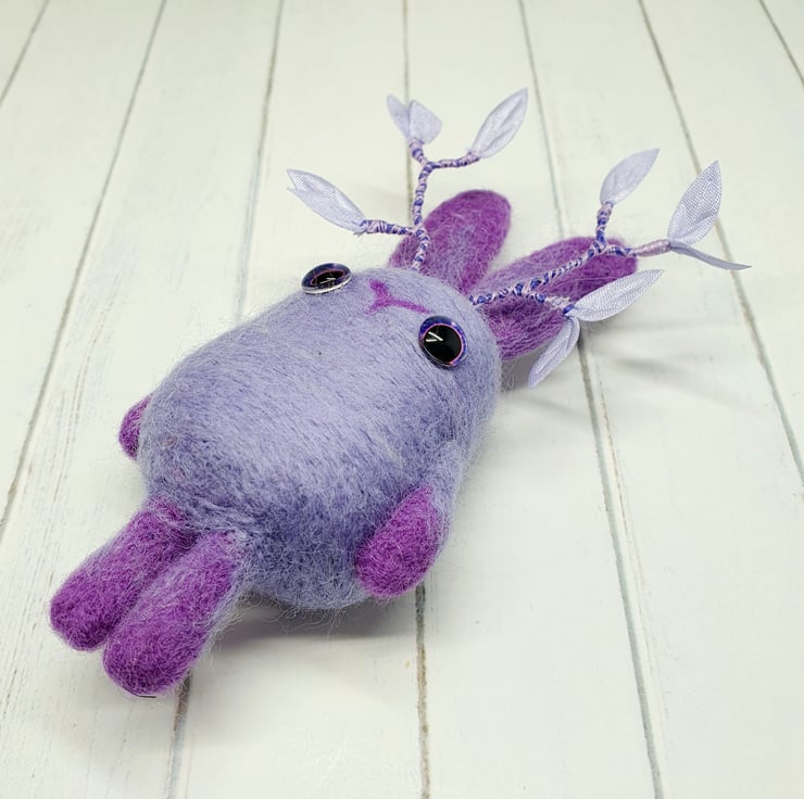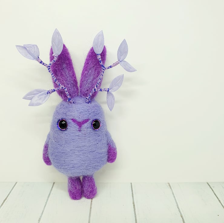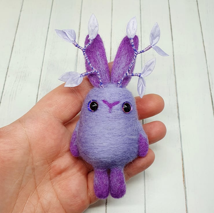 Needlefelted art doll with glass eyes. This cute little Jackalope has ombre arms, legs and ears and wired antlers decorated with purple leaves and thread. This Jackalope measures roughly 13cm tall and has the option of a transparent loop hanger. This is for decorative purposes only and not a toy.