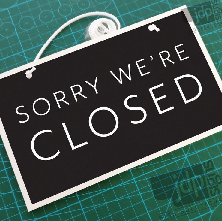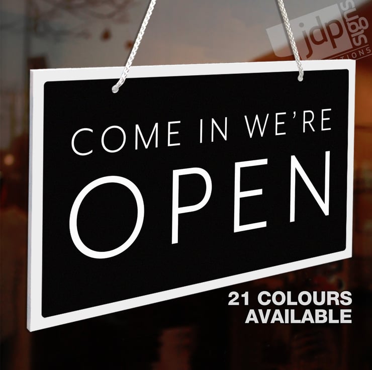 COME IN WE'RE OPEN - SORRY WE'RE CLOSED 3MM RIGID HANGING SIGN, SHOP WINDOW DOOR - 21 COLOURS