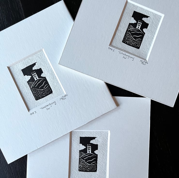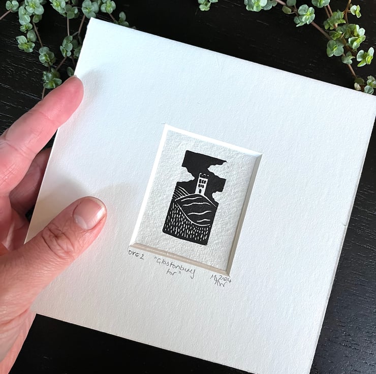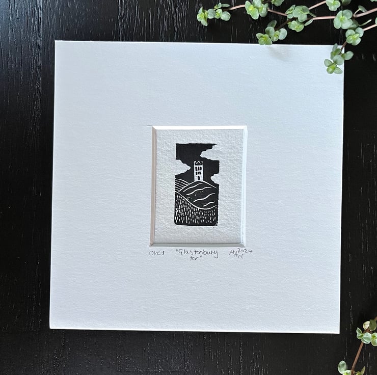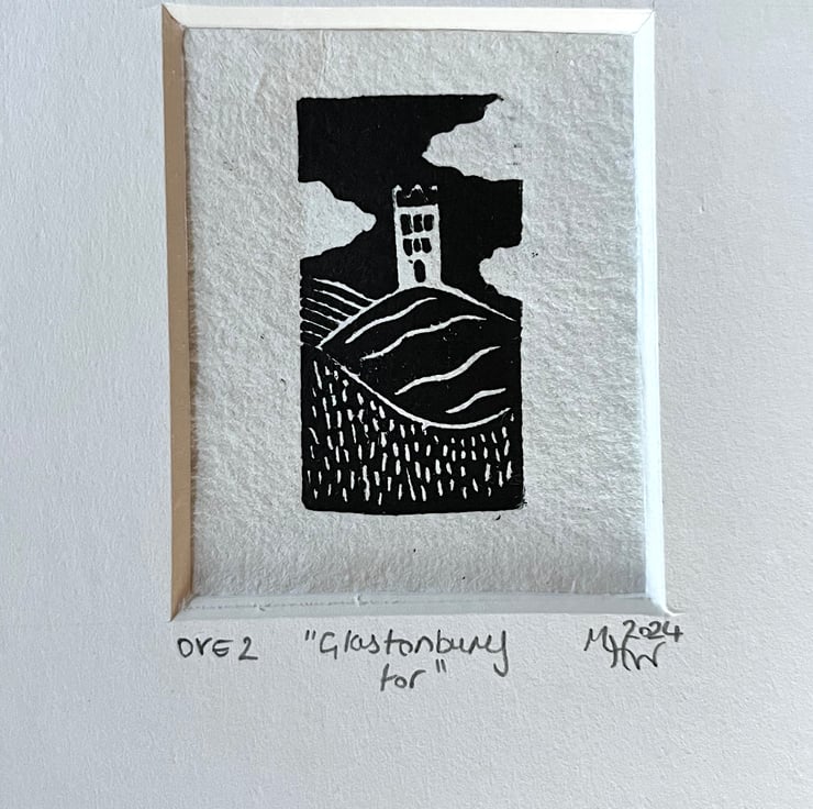 My husband and I recently took a trip to Glastonbury with or whippet, Franco, and as we were driving across the moors towards this beautiful town, we could see the Tor in the distance. This inspired me to do a mini lino carving of this very popular and well-visited iconic structure. I found the mini print to be so effective and decided it would look fabulous in a thick bordered mount, helping to really focus the viewers attention in on this piece.